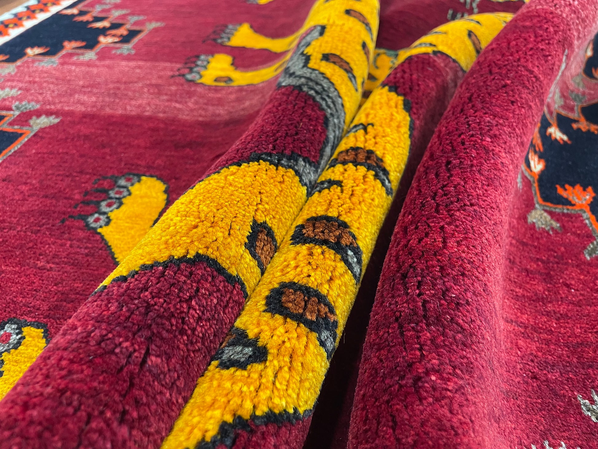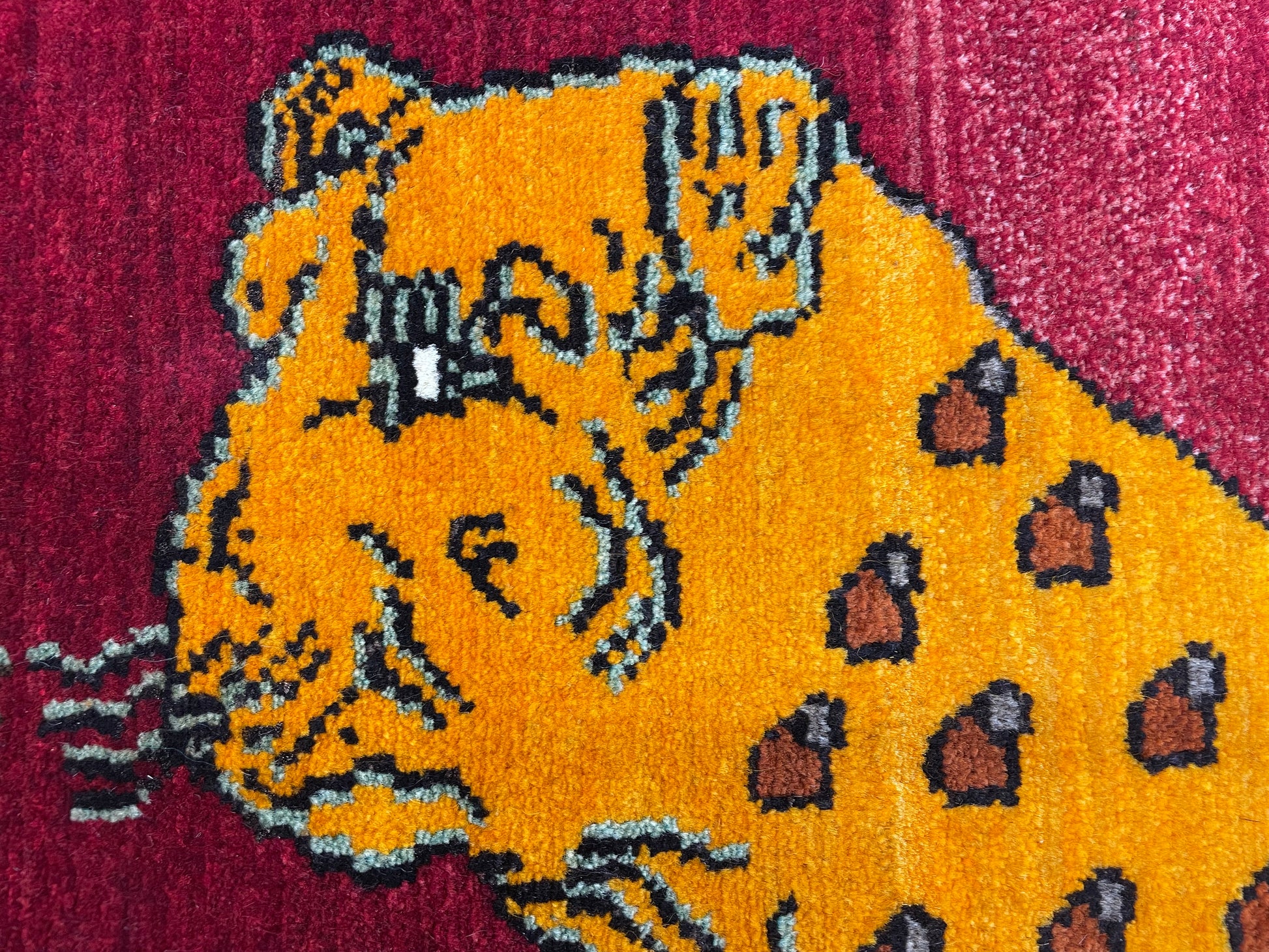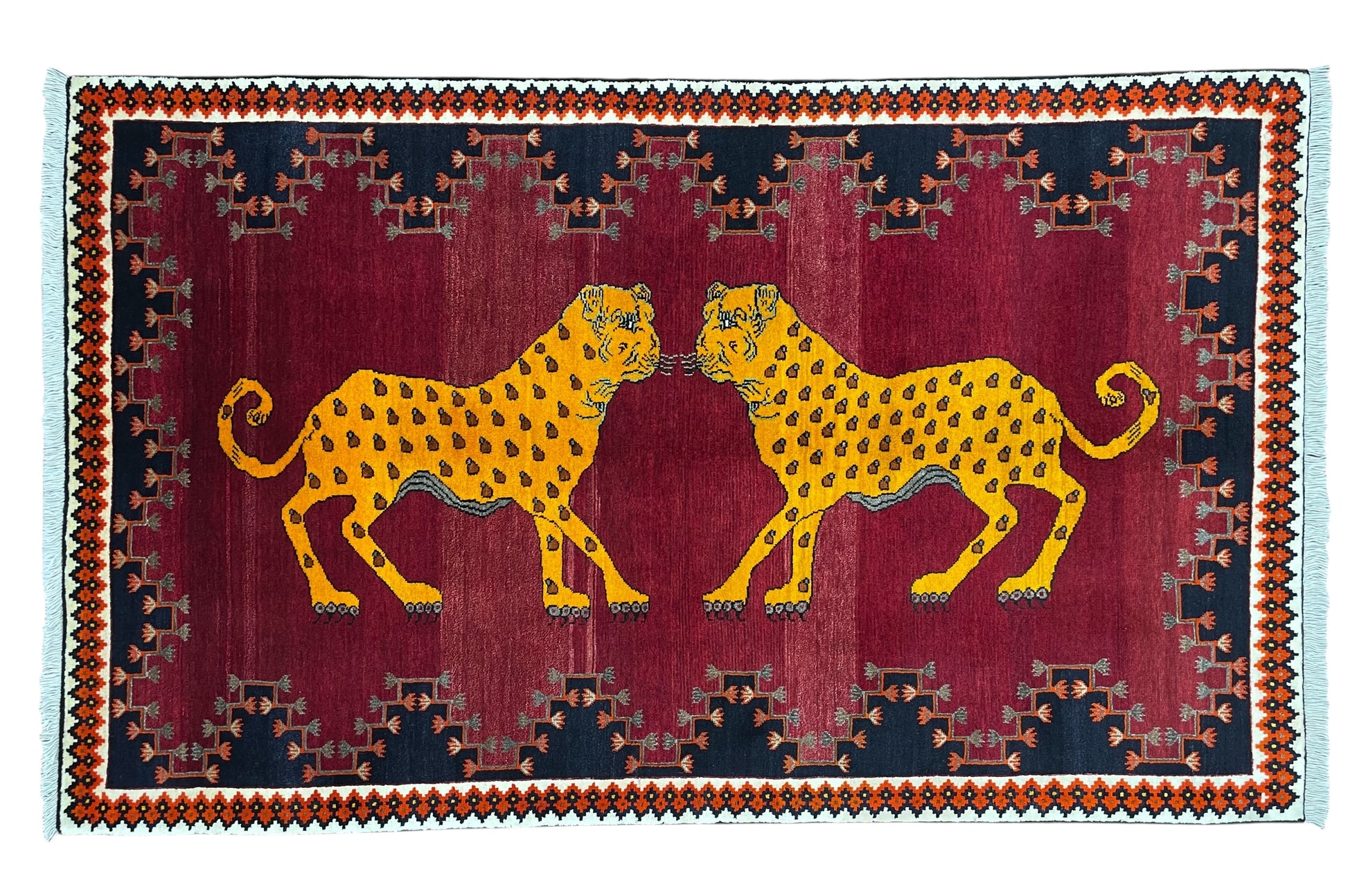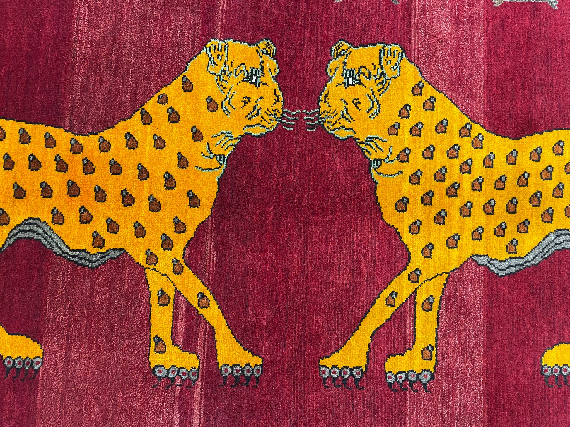 なかでも、ライオンやヒョウなどの猫科の動物をモチーフにしたデザインはこの地域の織り手が得意とするもので、勇ましいライオンから、かわいらしいライオンまで、織り手の想像力によって自由に表現されています。
