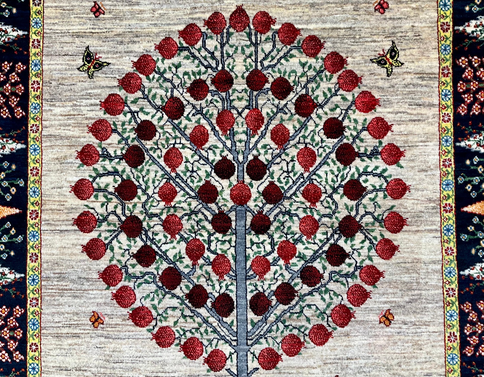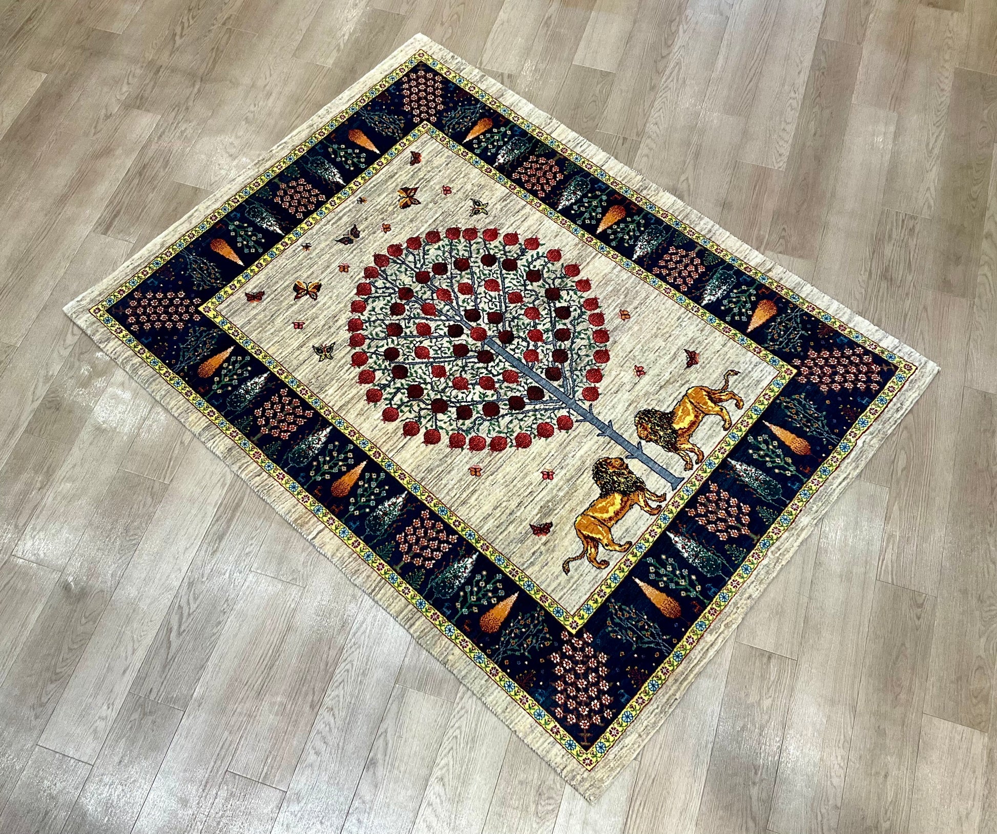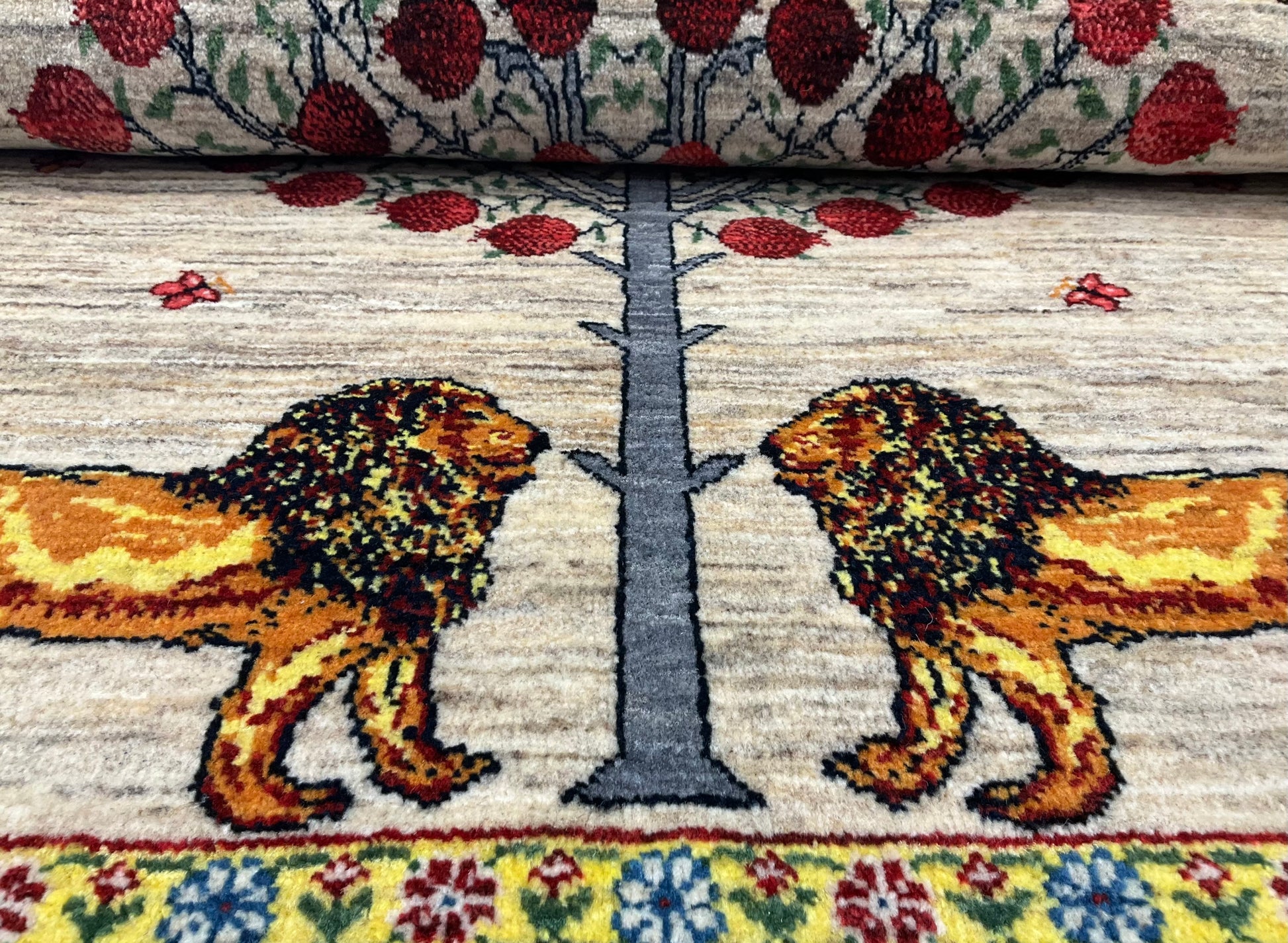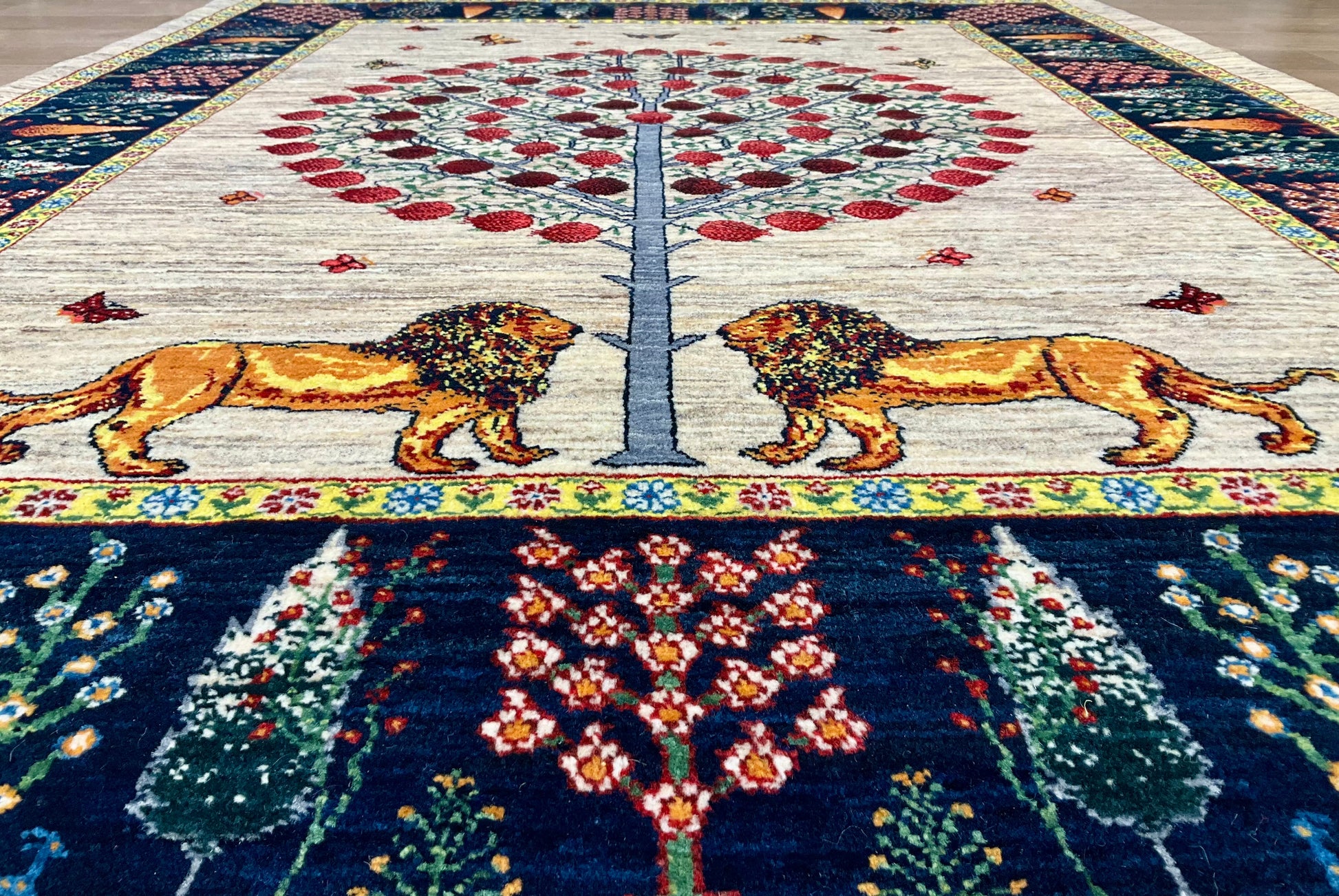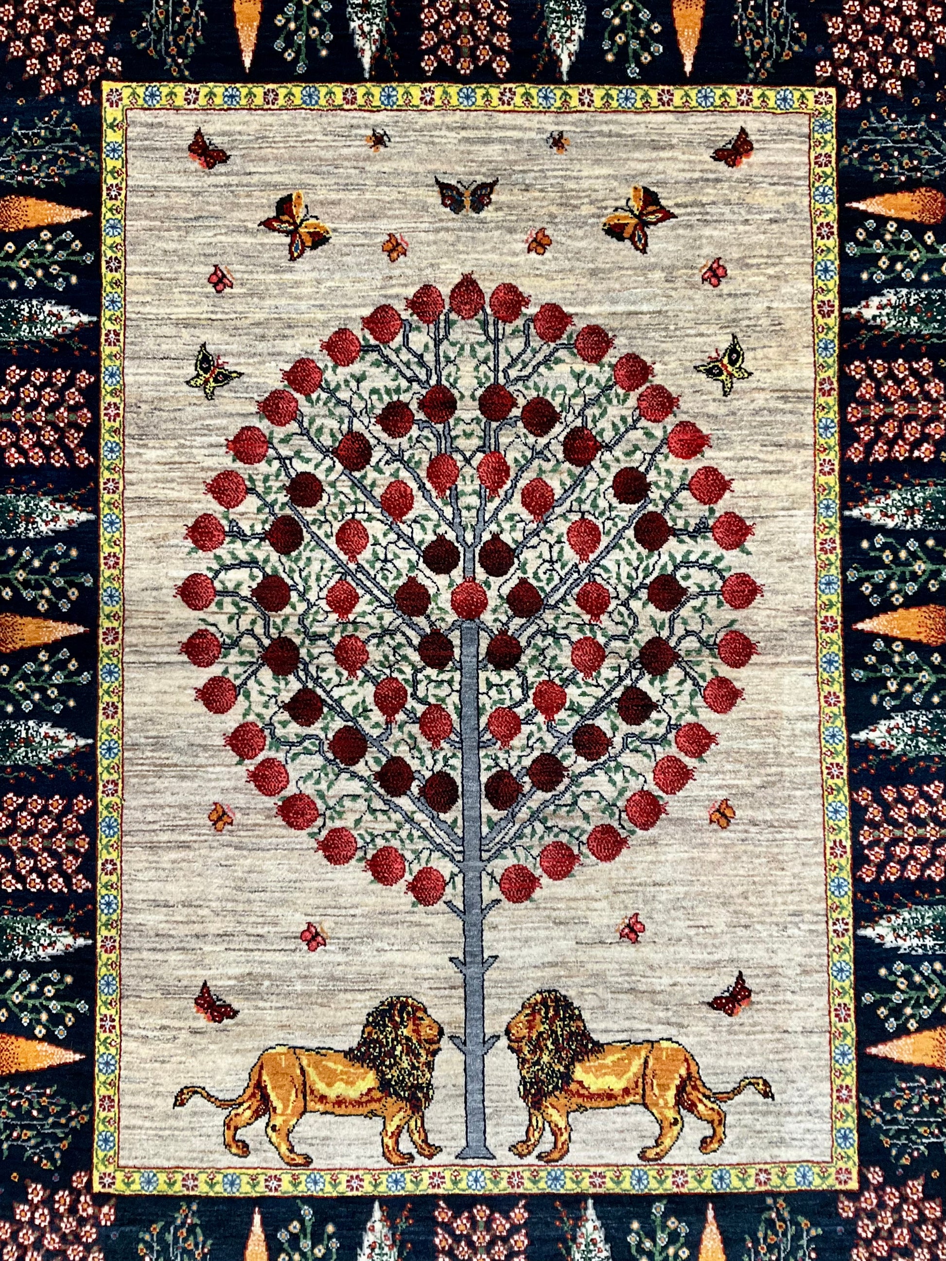 羊と共に生活する遊牧民が、その羊毛を草木で染め、日常の営みや目の前の自然をモチーフに織り上げます。文様には幸せの願いが込められており、例えば「羊・ヤギ」=家庭円満、「ライオン」=王者・力、「生命の木」=長寿・健康、「ざくろ」=子孫繫栄などが代表的です。