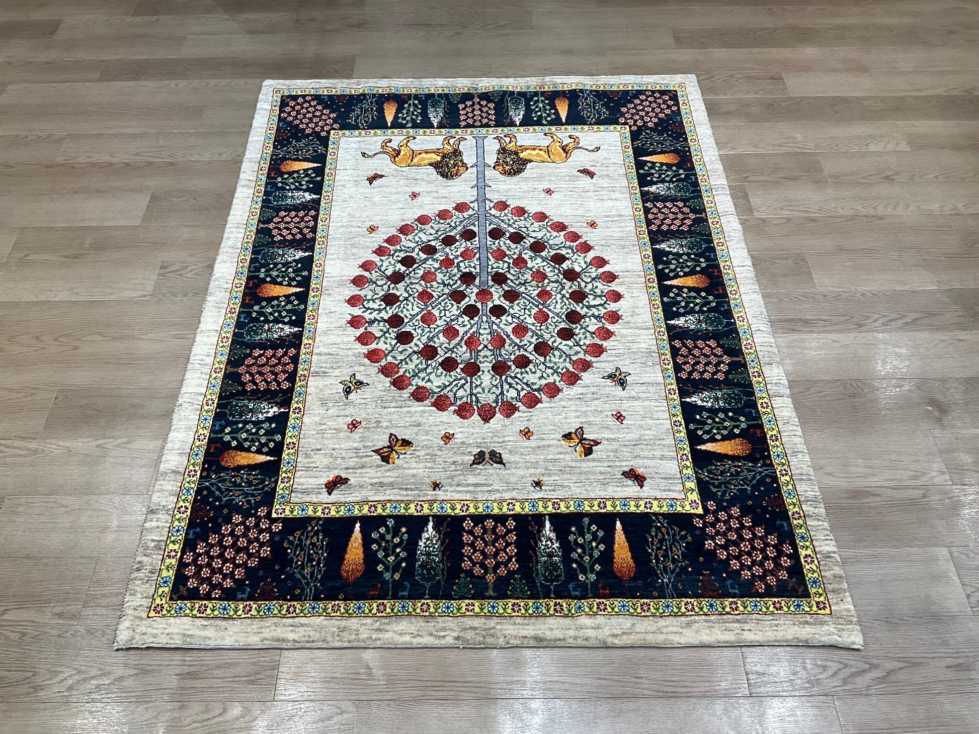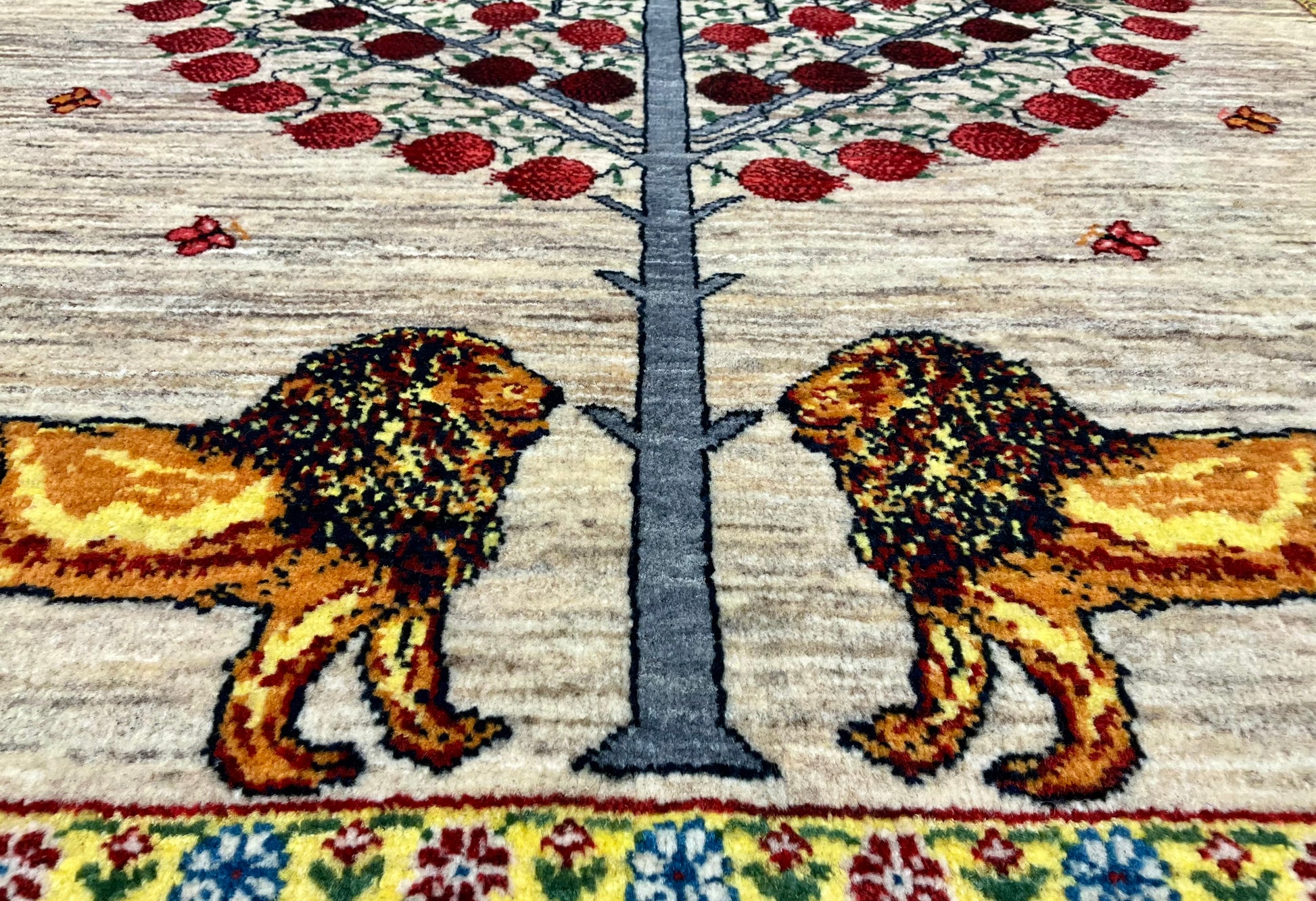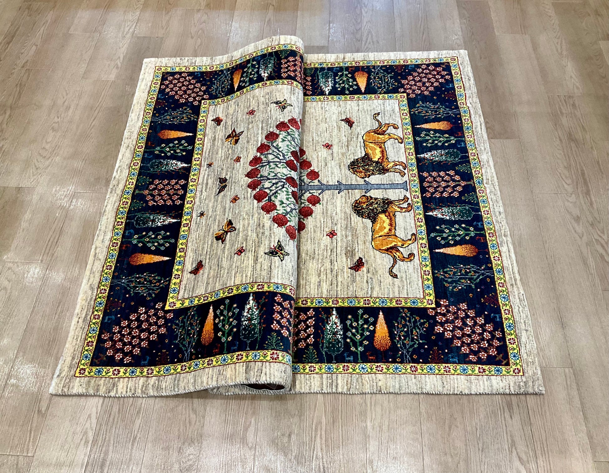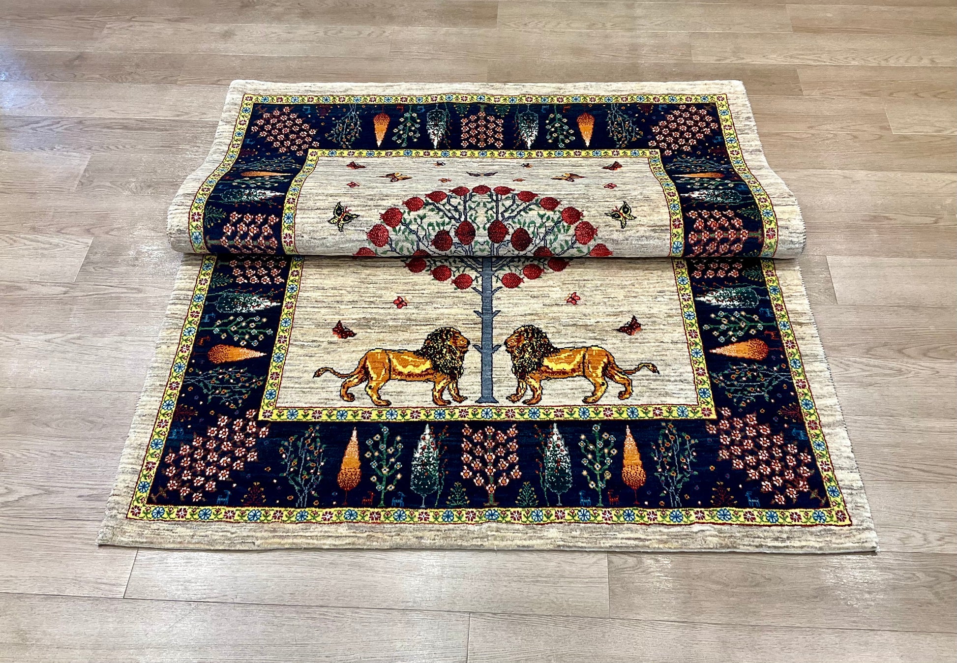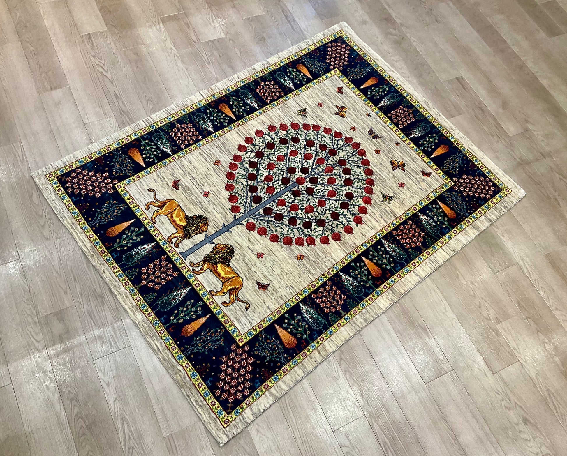 羊と共に生活する遊牧民が、その羊毛を草木で染め、日常の営みや目の前の自然をモチーフに織り上げます。文様には幸せの願いが込められており、例えば「羊・ヤギ」=家庭円満、「ライオン」=王者・力、「生命の木」=長寿・健康、「ざくろ」=子孫繫栄などが代表的です。