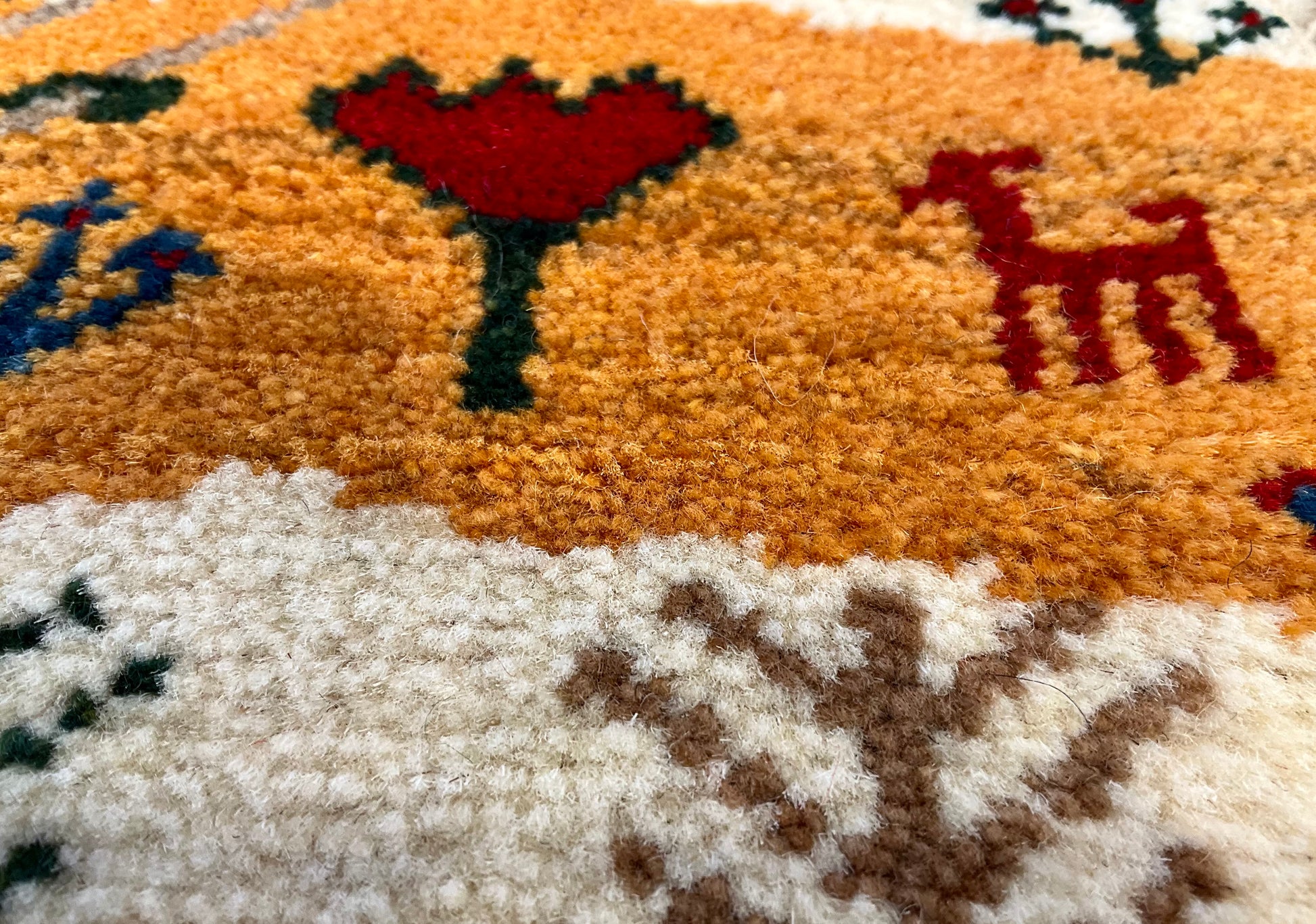 「羊・ヤギ」=家庭円満、「ライオン」=王者・力、「らくだ」=成功、「生命の木」=長寿・健康、「ざくろ」=子孫繫栄などの様々な文様が織り込まれることが多く、それぞれの文様に色々な願いが込められています。