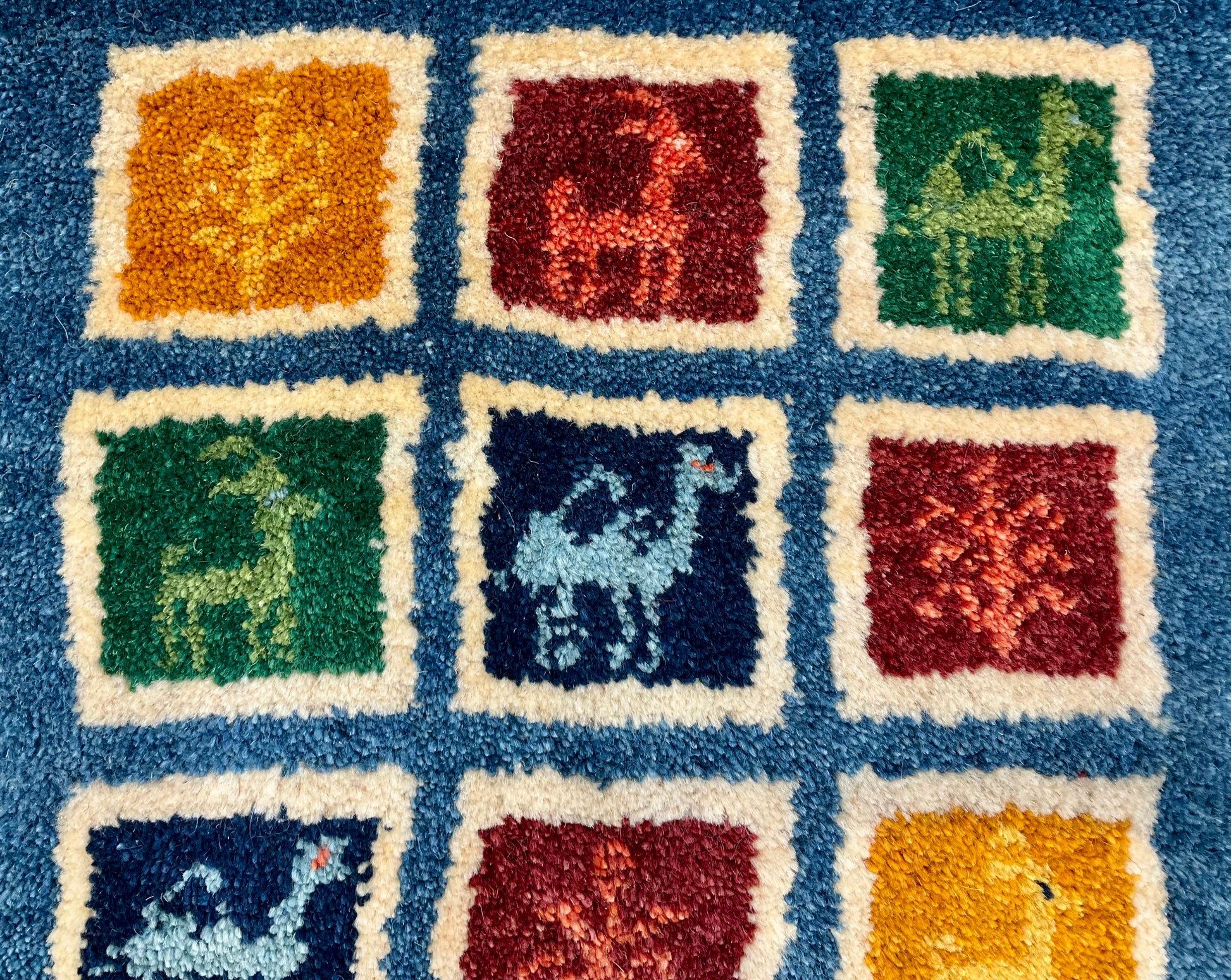 「羊・ヤギ」=家庭円満、「ライオン」=王者・力、「らくだ」=成功、「生命の木」=長寿・健康、「ざくろ」=子孫繫栄などの様々な文様が織り込まれることが多く、それぞれの文様に色々な願いが込められています。