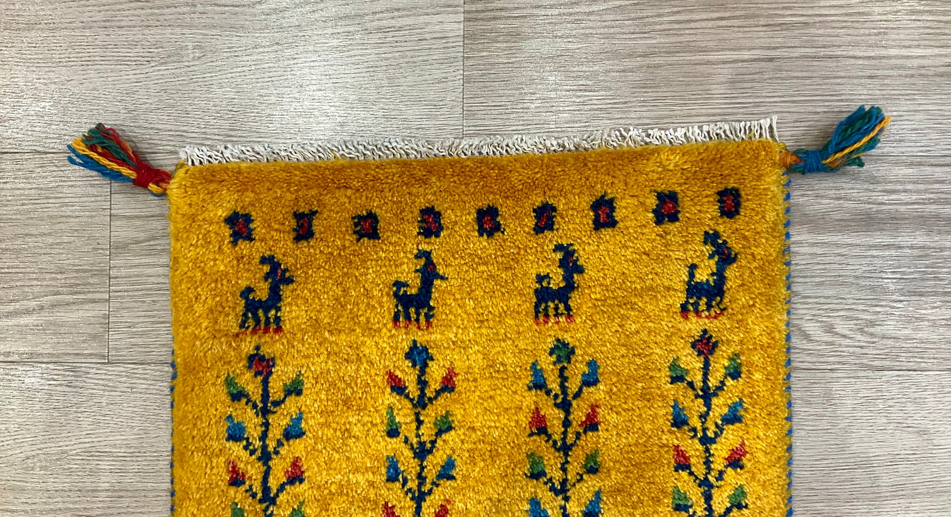 「羊・ヤギ」=家庭円満、「ライオン」=王者・力、「らくだ」=成功、「生命の木」=長寿・健康、「ざくろ」=子孫繫栄などの様々な文様が織り込まれることが多く、それぞれの文様に色々な願いが込められています。