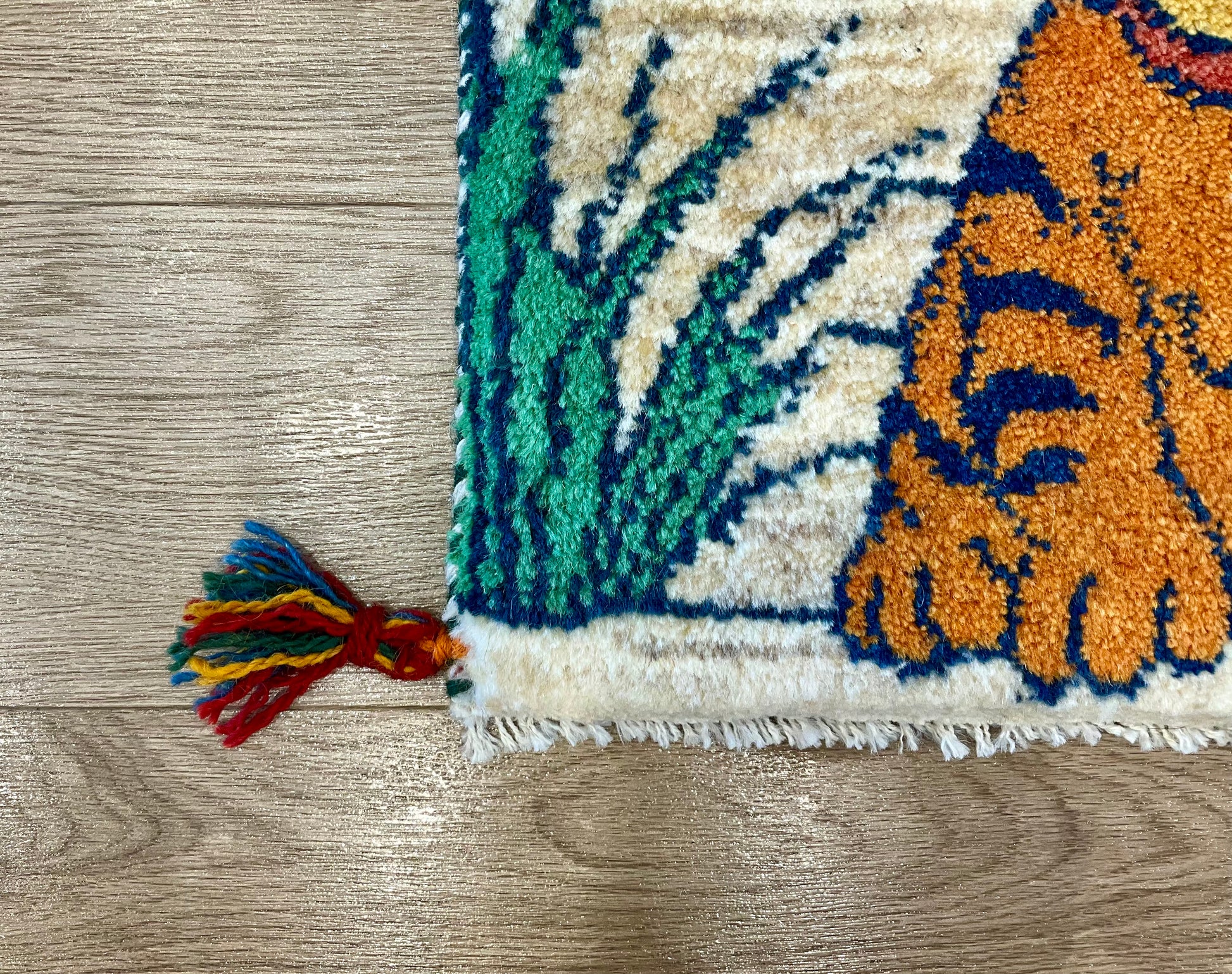 「羊・ヤギ」=家庭円満、「ライオン」=王者・力、「らくだ」=成功、「生命の木」=長寿・健康、「ざくろ」=子孫繫栄などの様々な文様が織り込まれることが多く、それぞれの文様に色々な願いが込められています。
