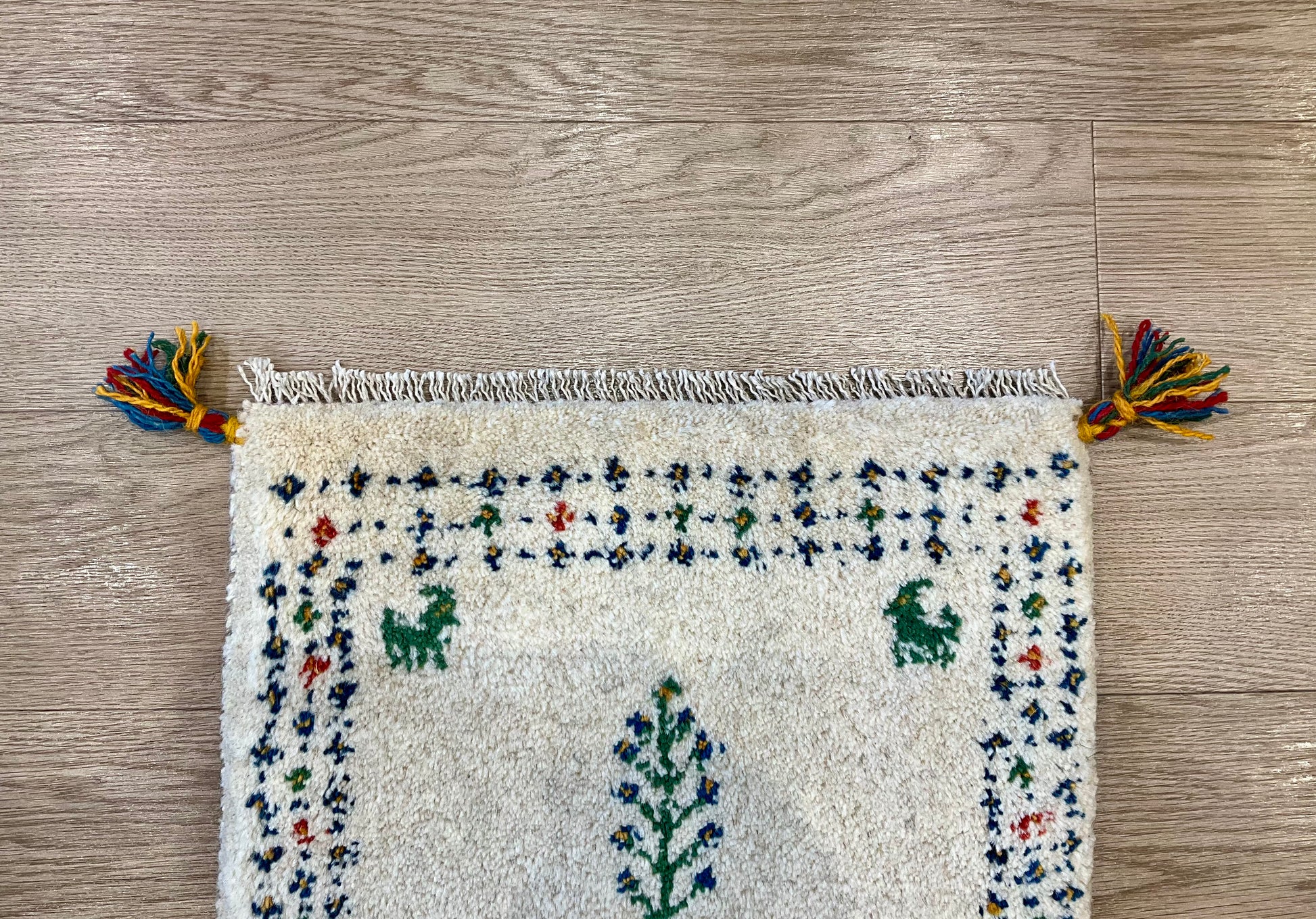 「羊・ヤギ」=家庭円満、「ライオン」=王者・力、「らくだ」=成功、「生命の木」=長寿・健康、「ざくろ」=子孫繫栄などの様々な文様が織り込まれることが多く、それぞれの文様に色々な願いが込められています。