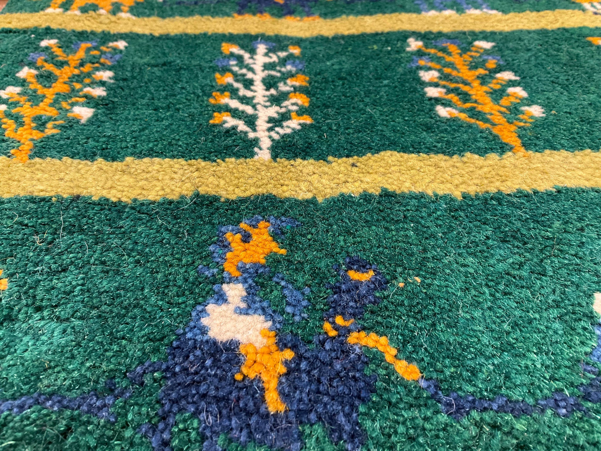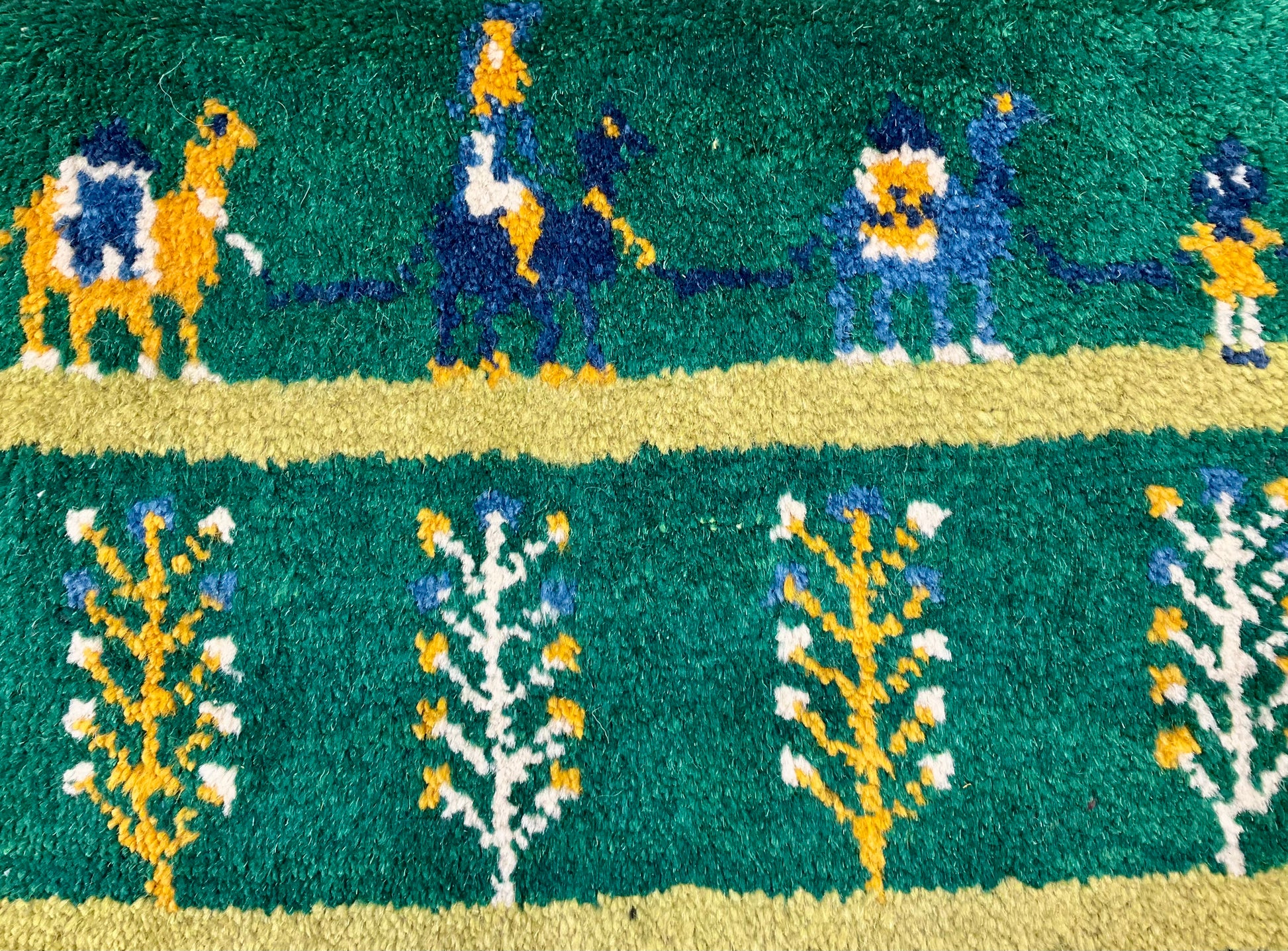 「羊・ヤギ」=家庭円満、「ライオン」=王者・力、「らくだ」=成功、「生命の木」=長寿・健康、「ざくろ」=子孫繫栄などの様々な文様が織り込まれることが多く、それぞれの文様に色々な願いが込められています。