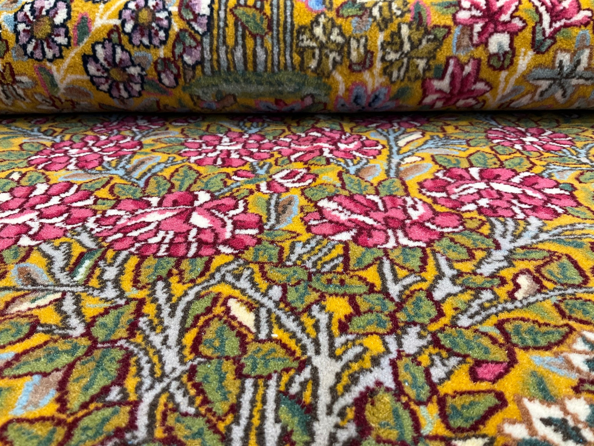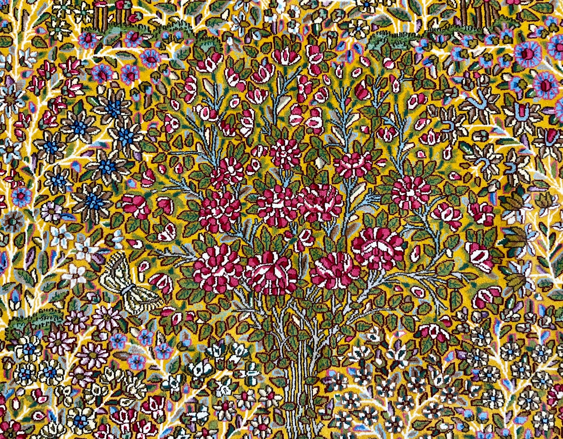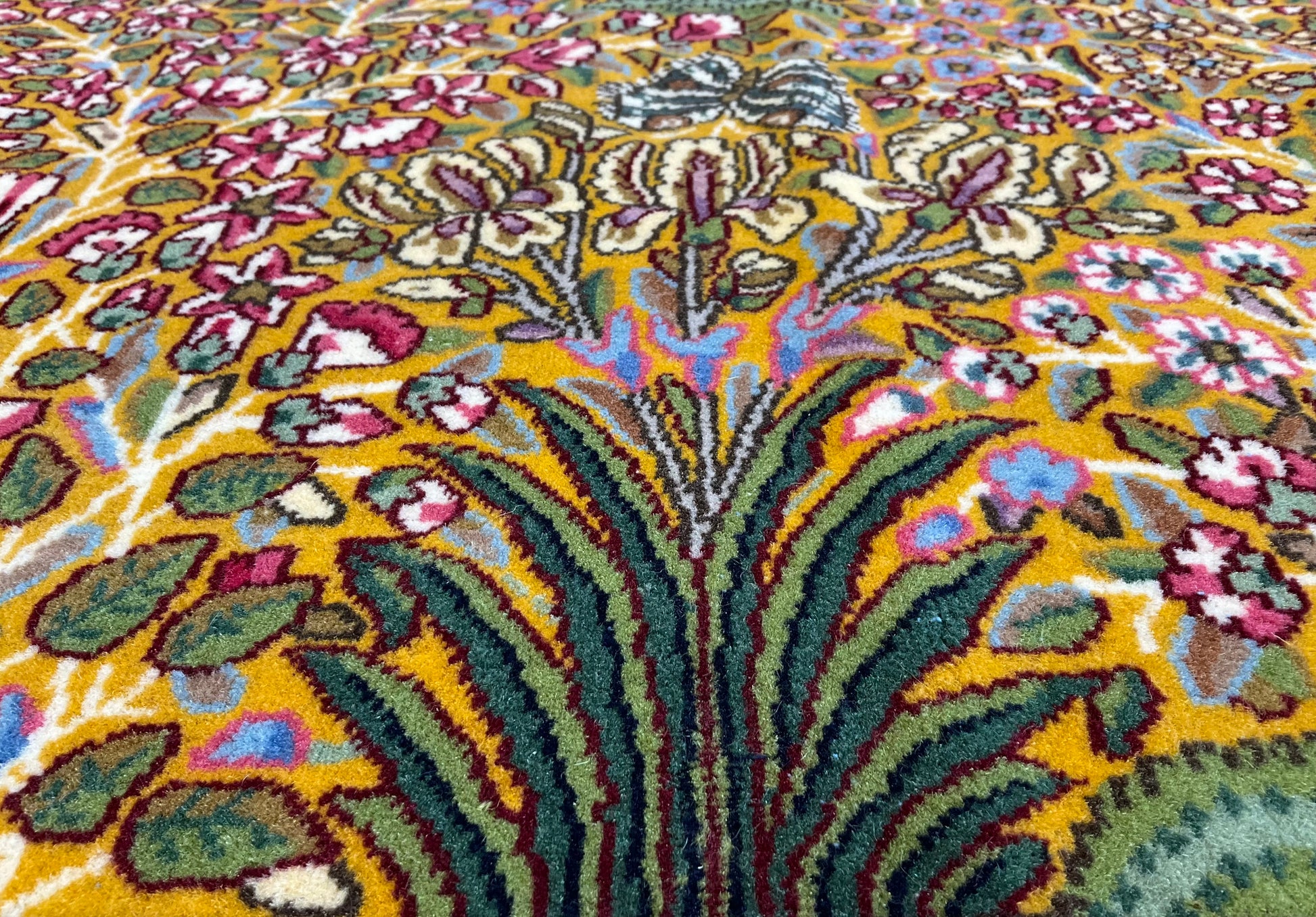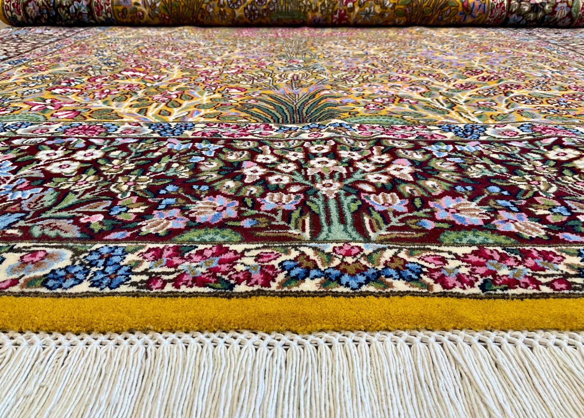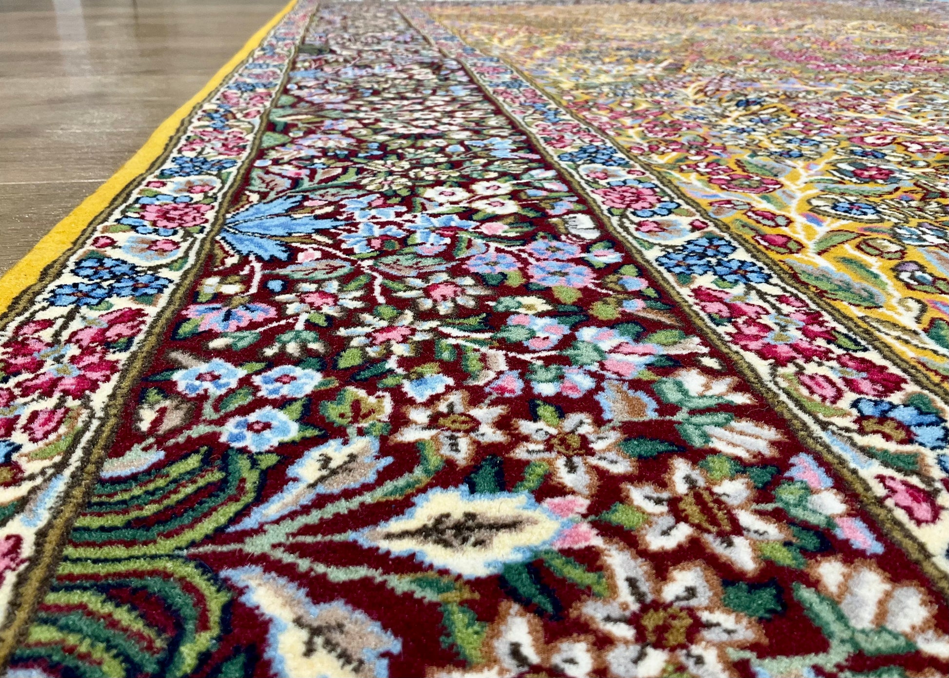 ケルマンの絨毯は、「Hezar」=千、「Gol」=花、「千の花の絨毯」と言われ、まるで色とりどりの美しい「千の花」が散りばめられたようなデザインが多く織られているのが特徴です。