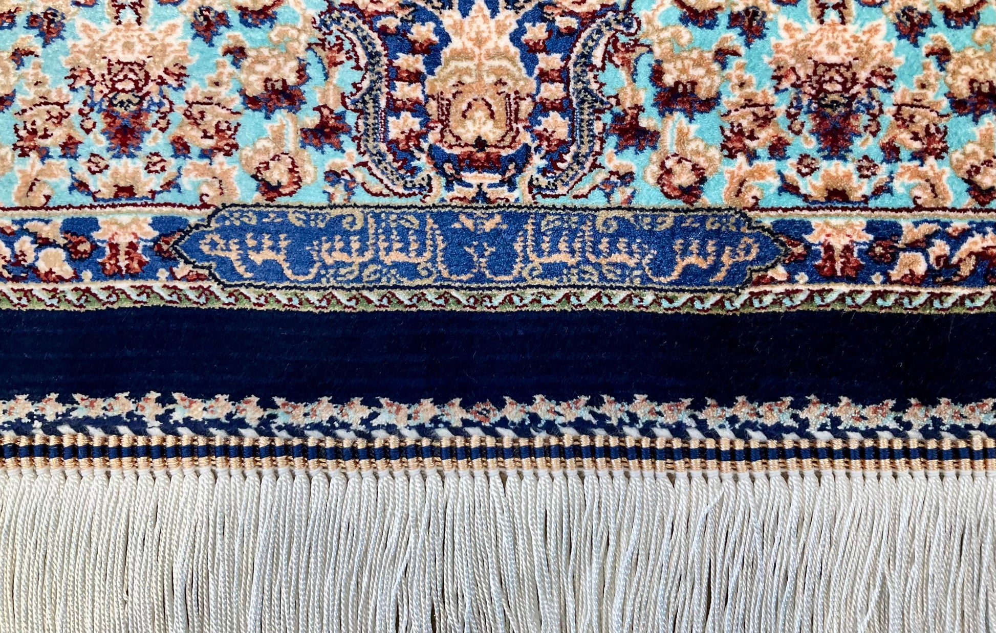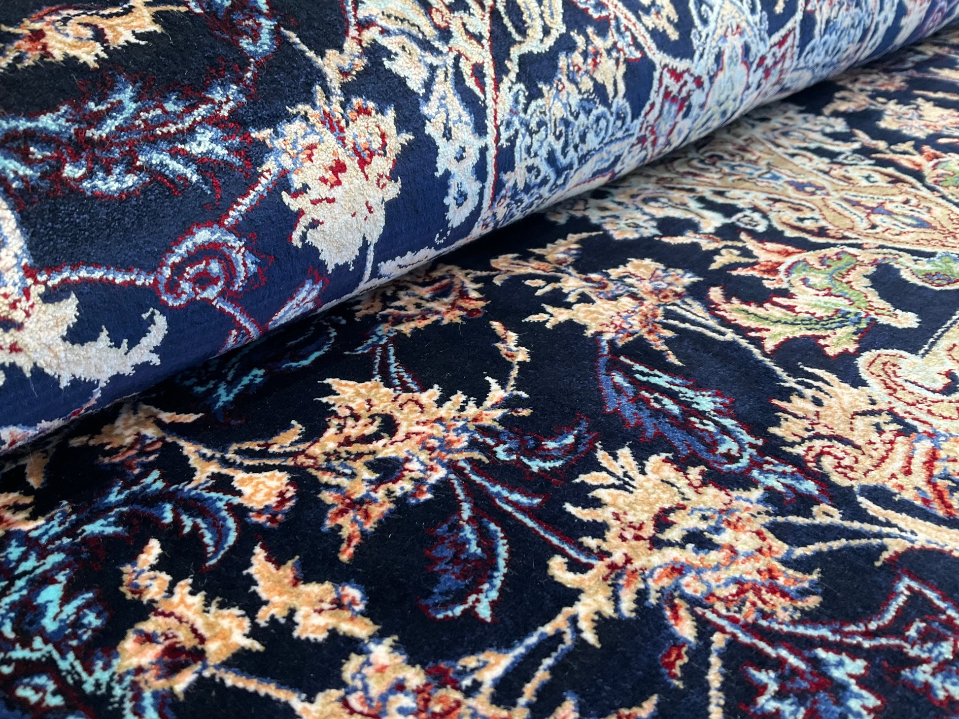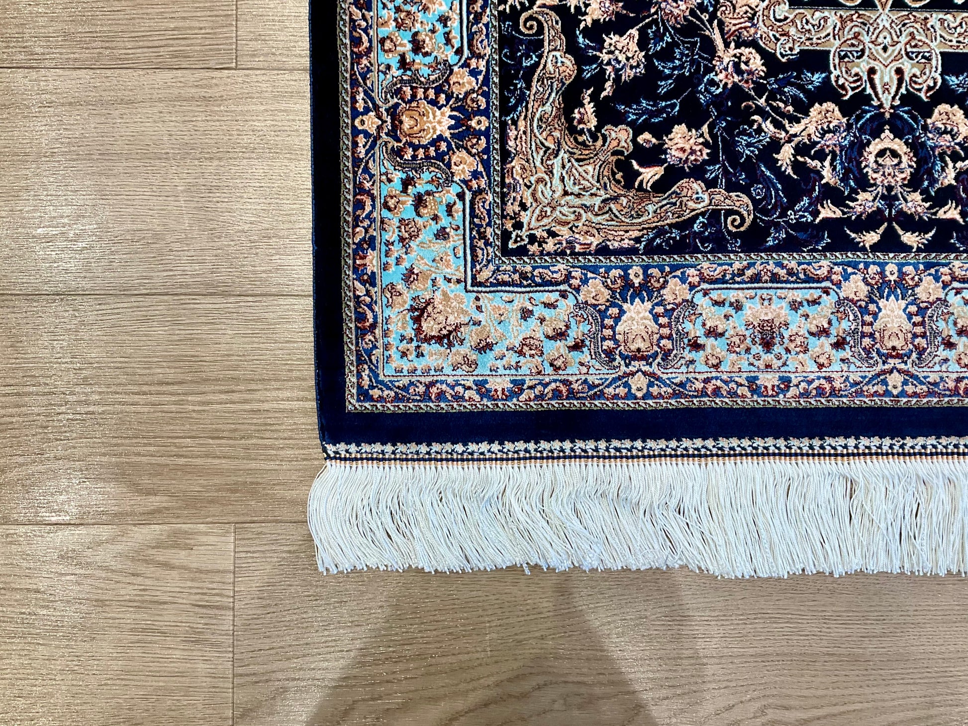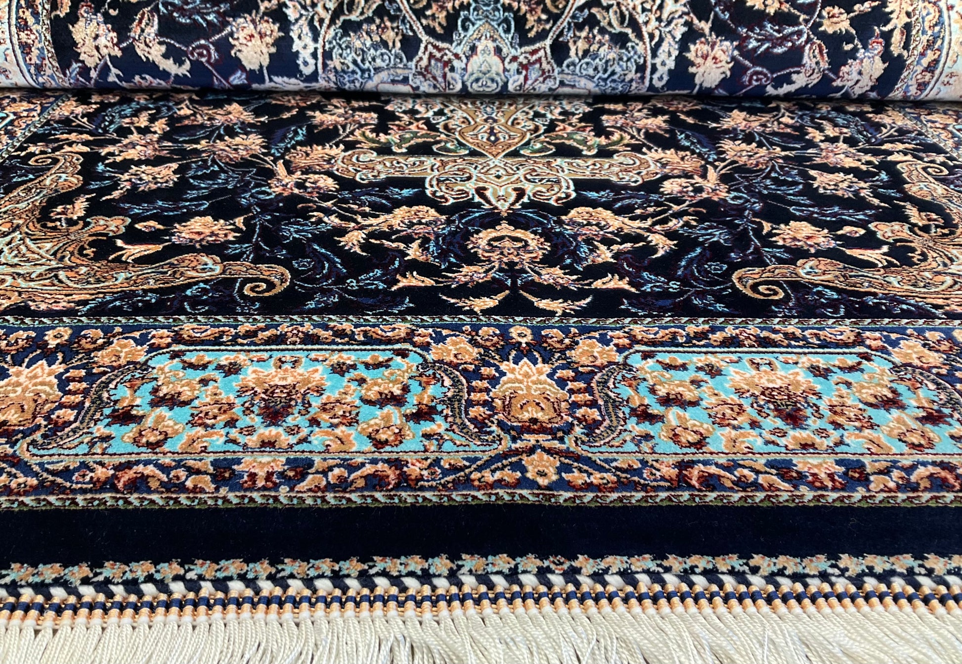機械織り絨毯の特長として、サイズやノットが均一で精度が高く仕上がる点が挙げられます(フリンジ部分は手作業で仕上げられます)。また、ペルシャ絨毯ならではの美しいデザインや質感は、五大産地のひとつカシャーンで制作されているため、手織り絨毯に劣らない美しさを誇ります。