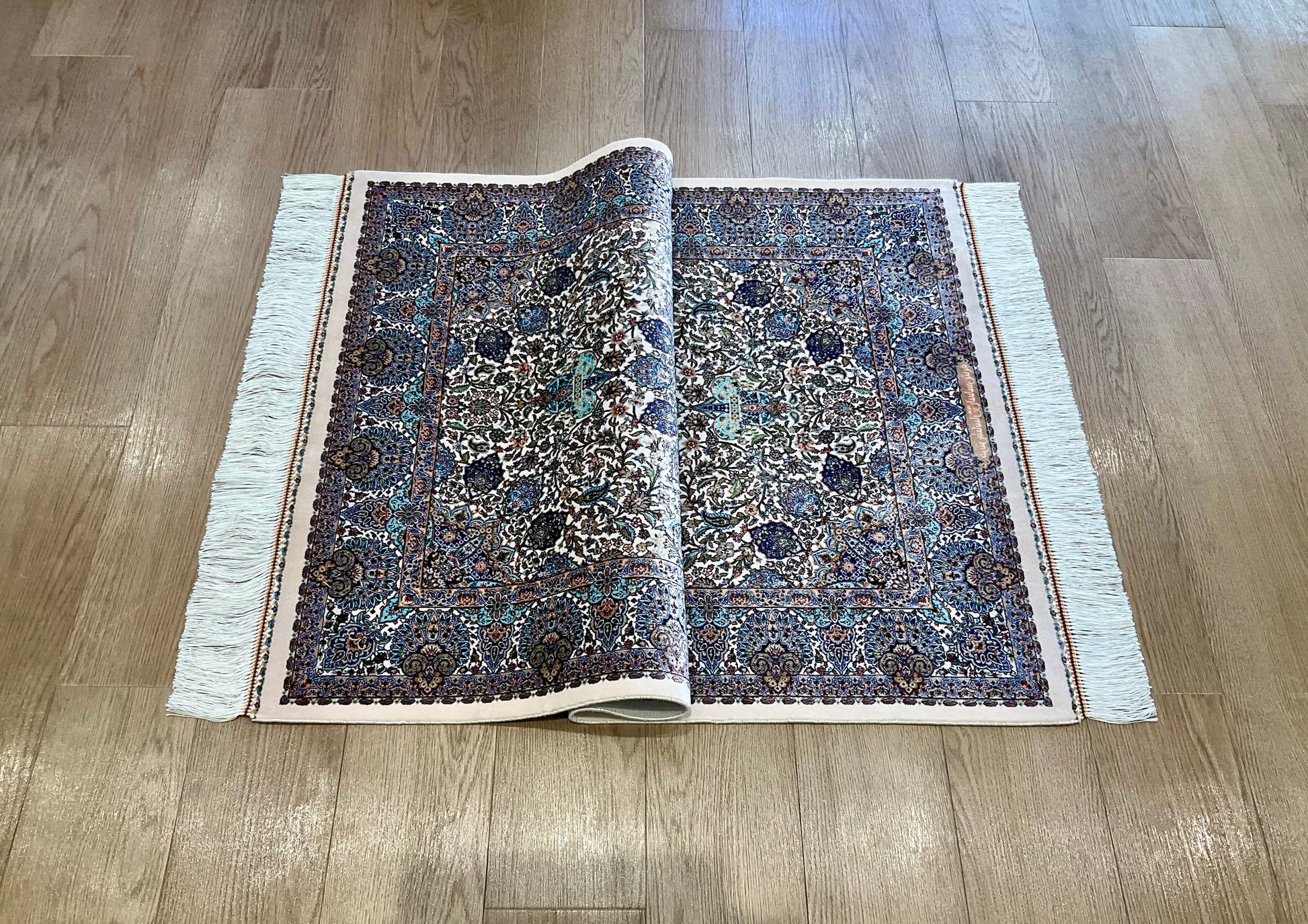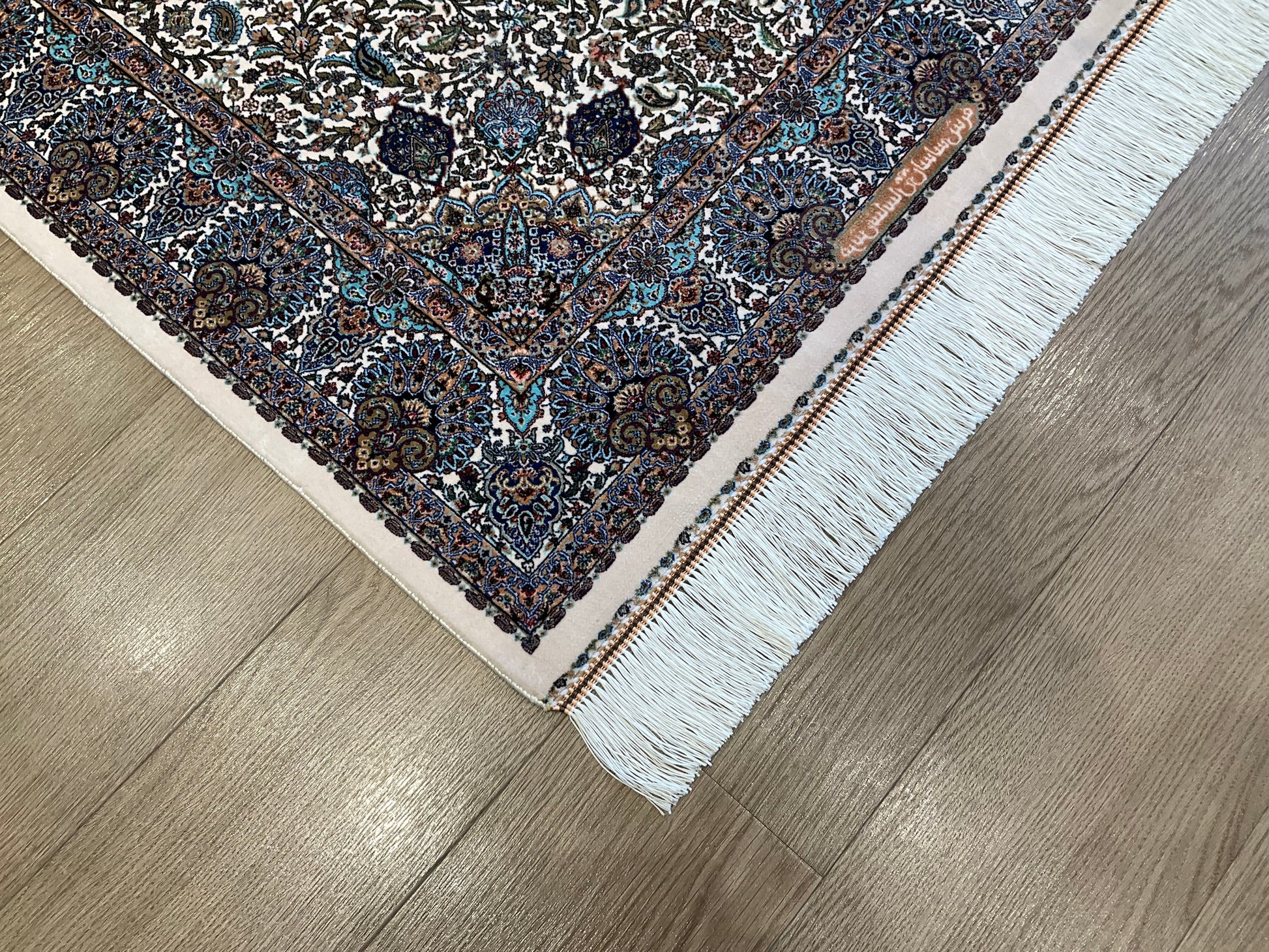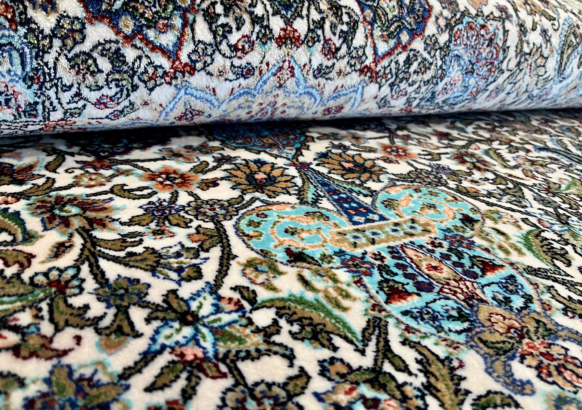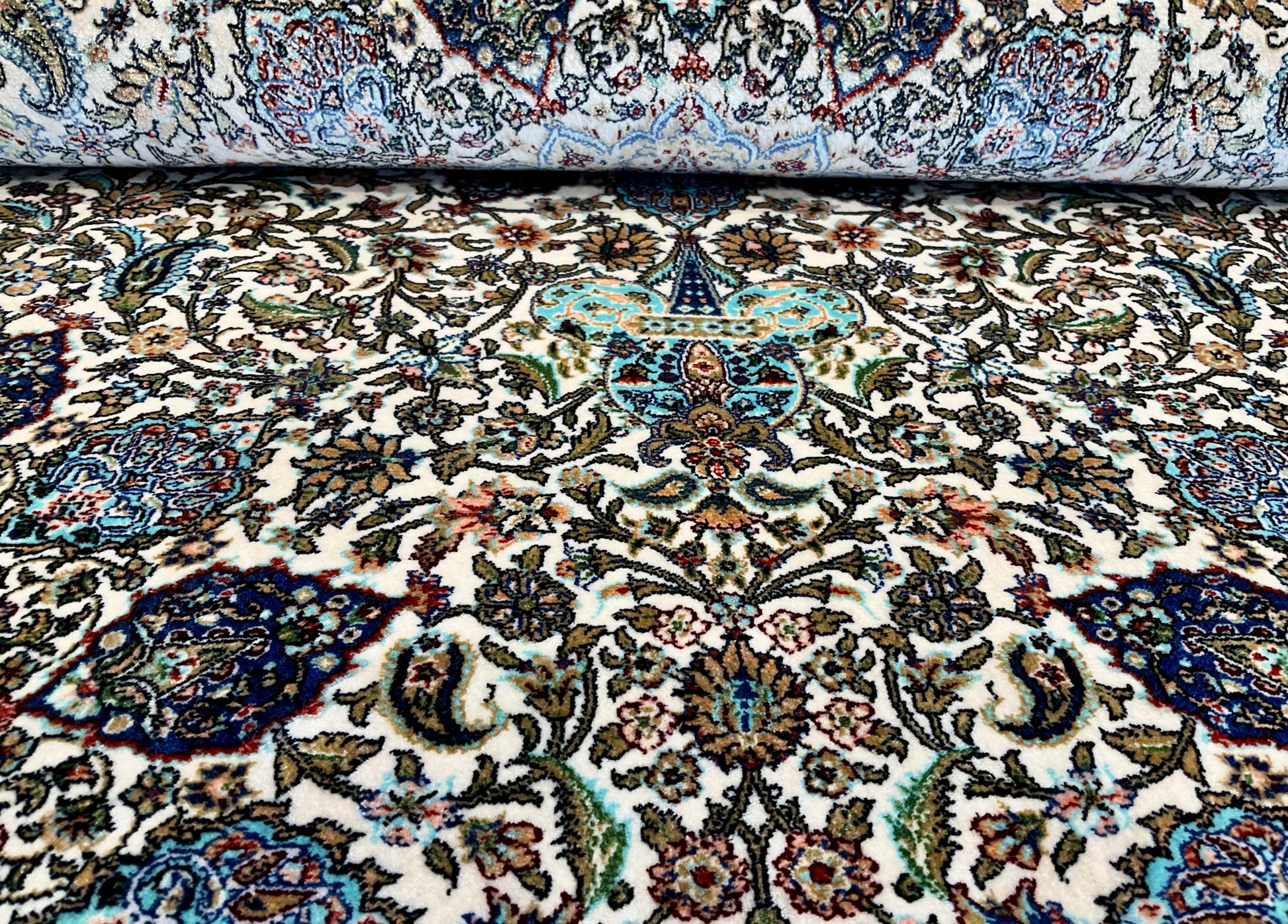 機械織り絨毯の特長として、サイズやノットが均一で精度が高く仕上がる点が挙げられます(フリンジ部分は手作業で仕上げられます)。また、ペルシャ絨毯ならではの美しいデザインや質感は、五大産地のひとつカシャーンで制作されているため、手織り絨毯に劣らない美しさを誇ります。