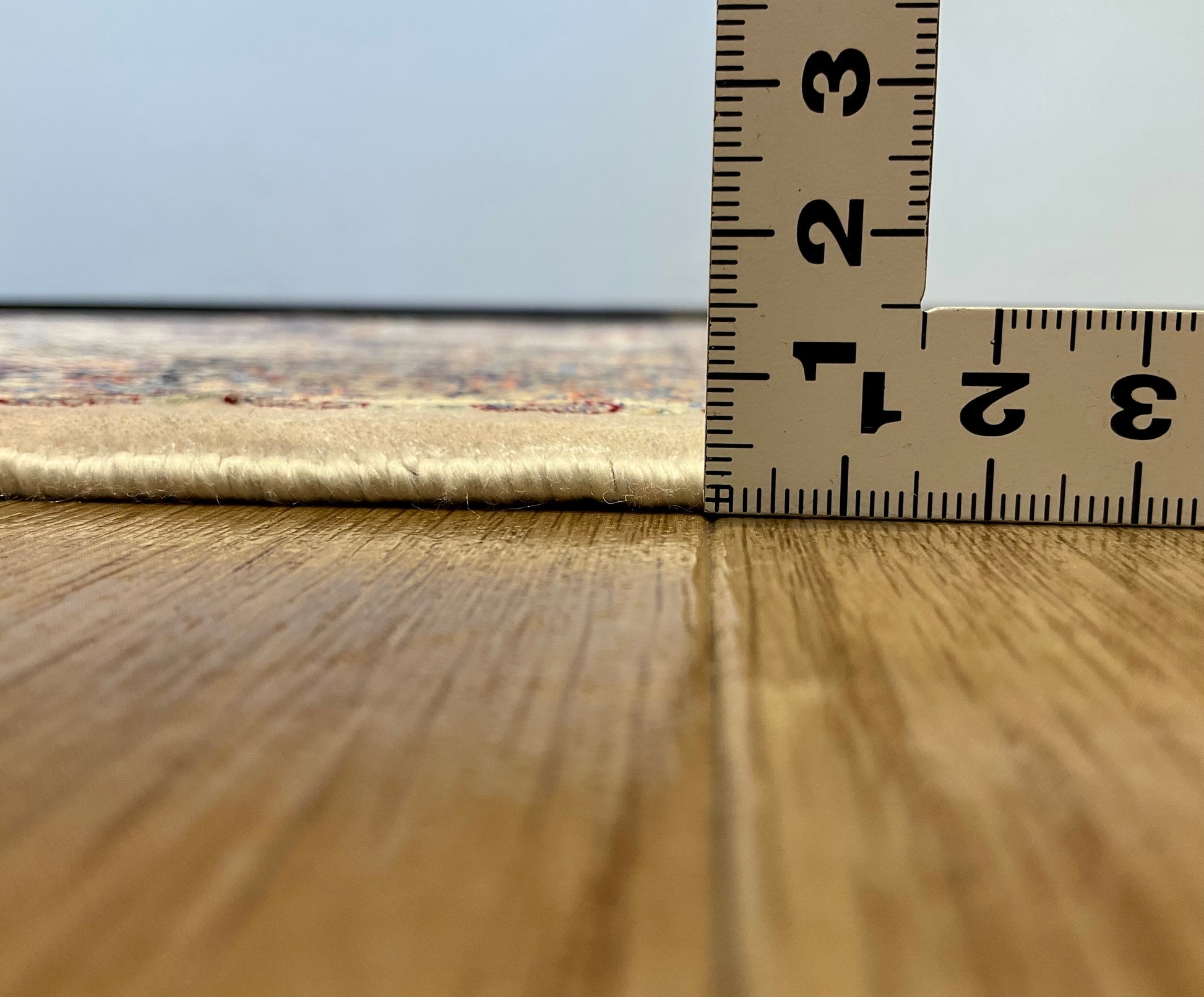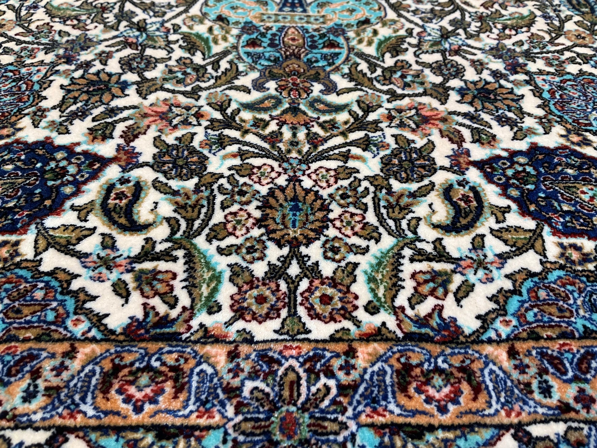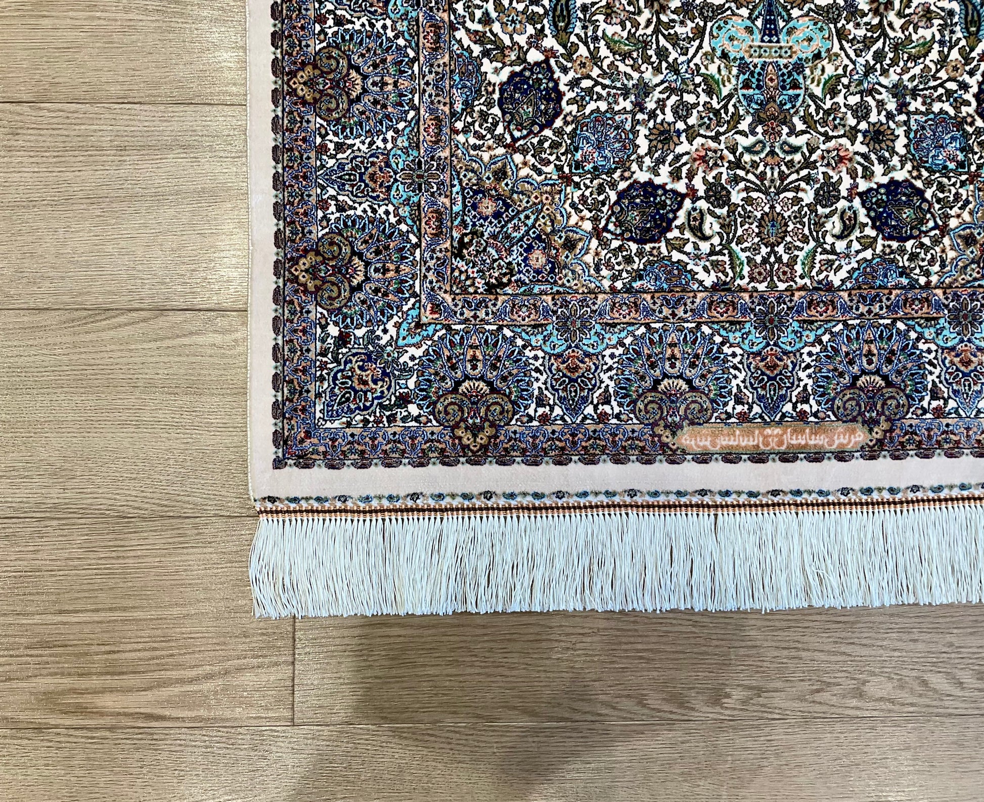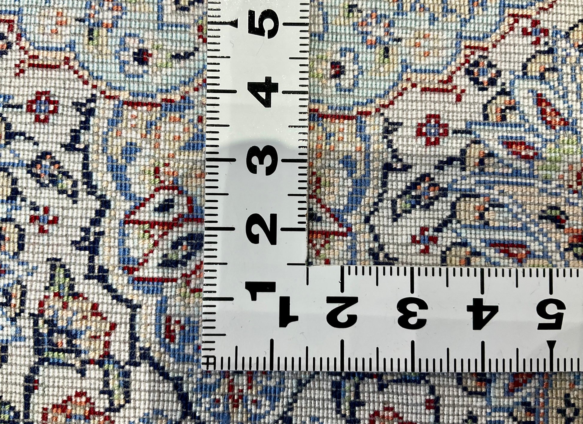 機械織り絨毯の特長として、サイズやノットが均一で精度が高く仕上がる点が挙げられます(フリンジ部分は手作業で仕上げられます)。また、ペルシャ絨毯ならではの美しいデザインや質感は、五大産地のひとつカシャーンで制作されているため、手織り絨毯に劣らない美しさを誇ります。