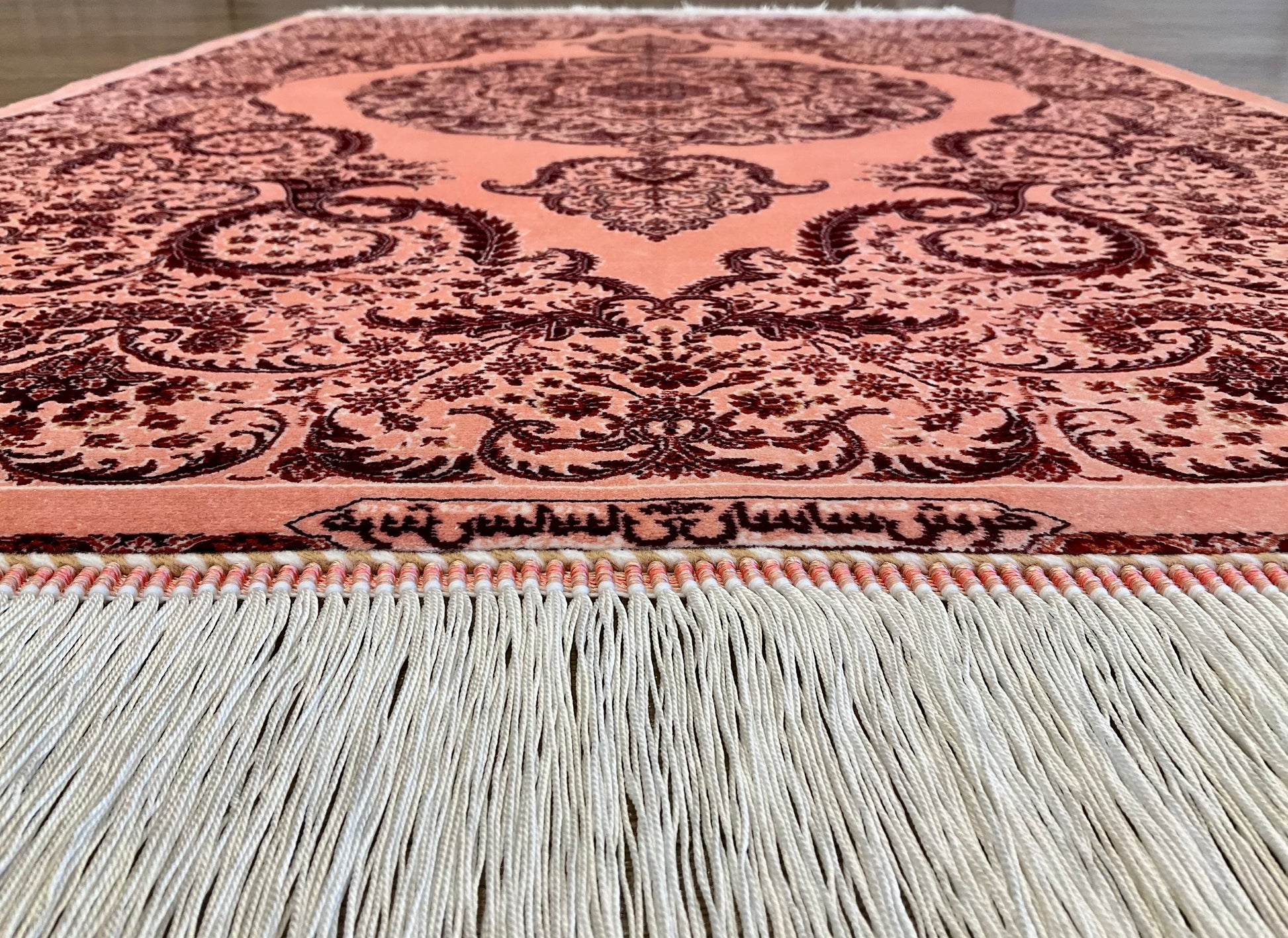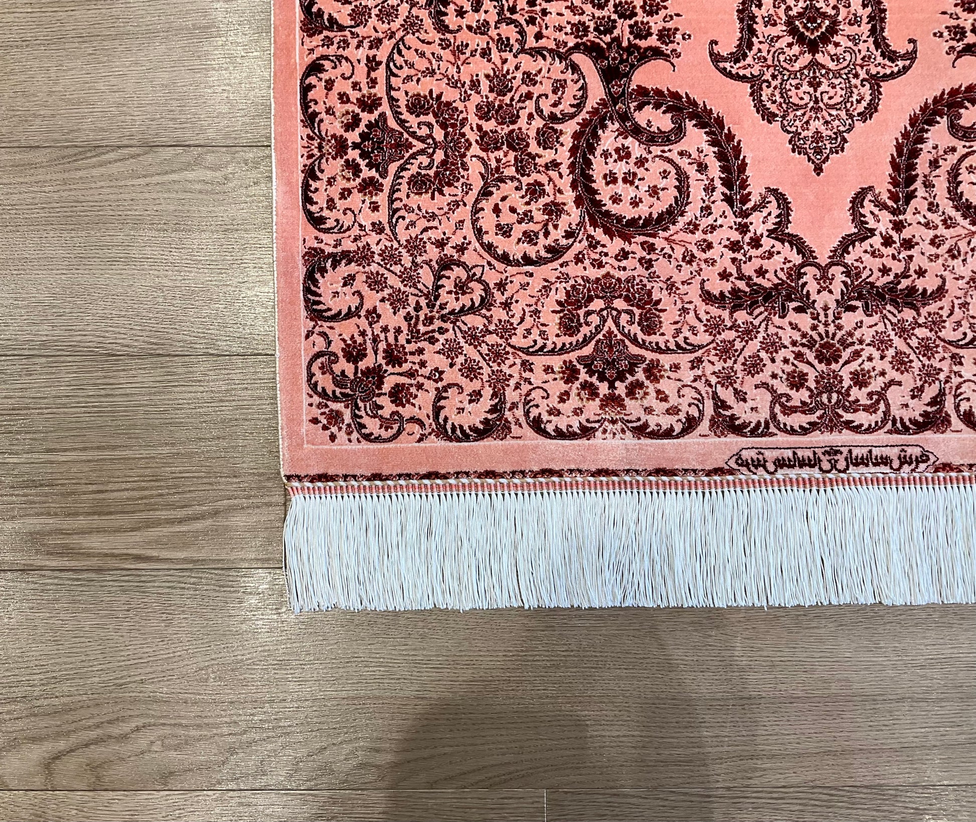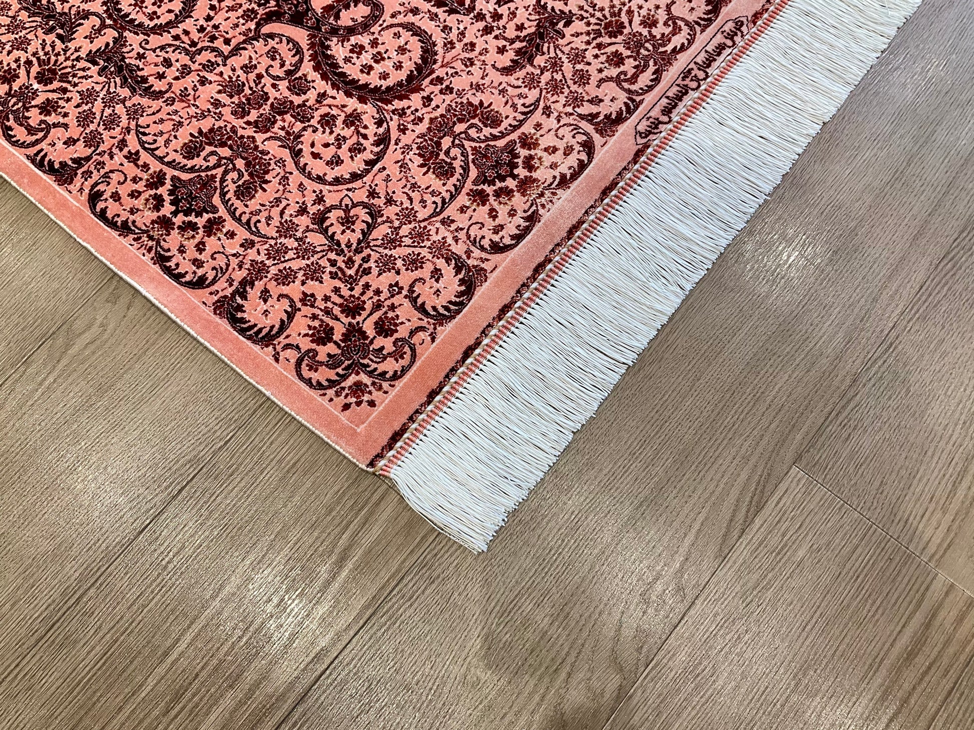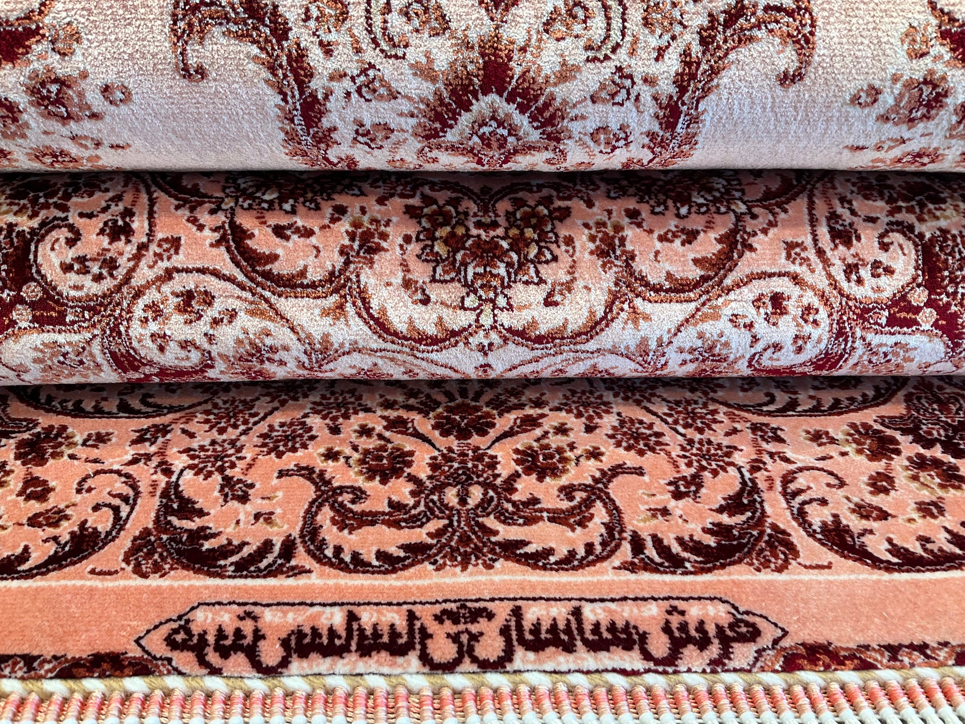 機械織り絨毯の特長として、サイズやノットが均一で精度が高く仕上がる点が挙げられます(フリンジ部分は手作業で仕上げられます)。また、ペルシャ絨毯ならではの美しいデザインや質感は、五大産地のひとつカシャーンで制作されているため、手織り絨毯に劣らない美しさを誇ります。