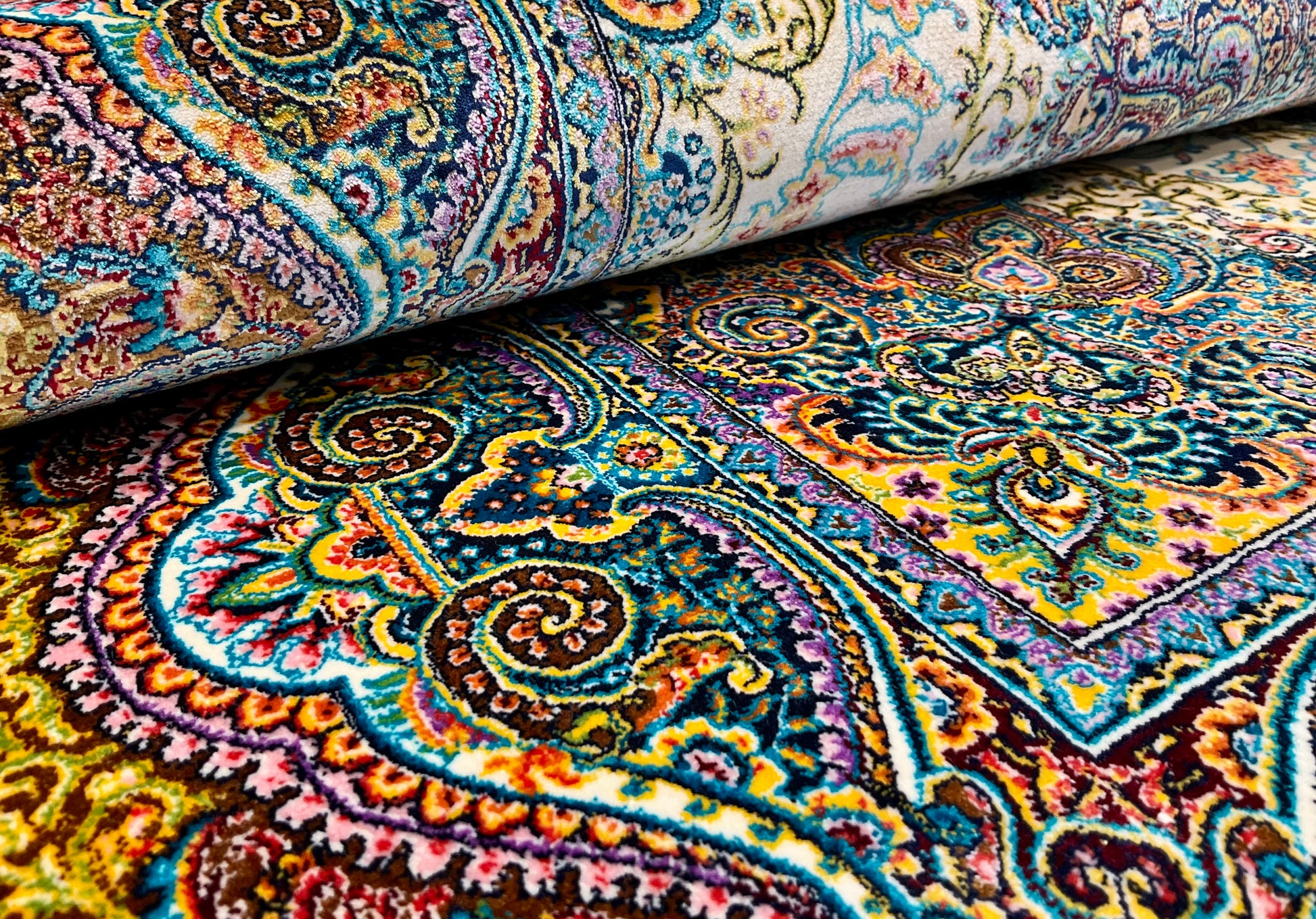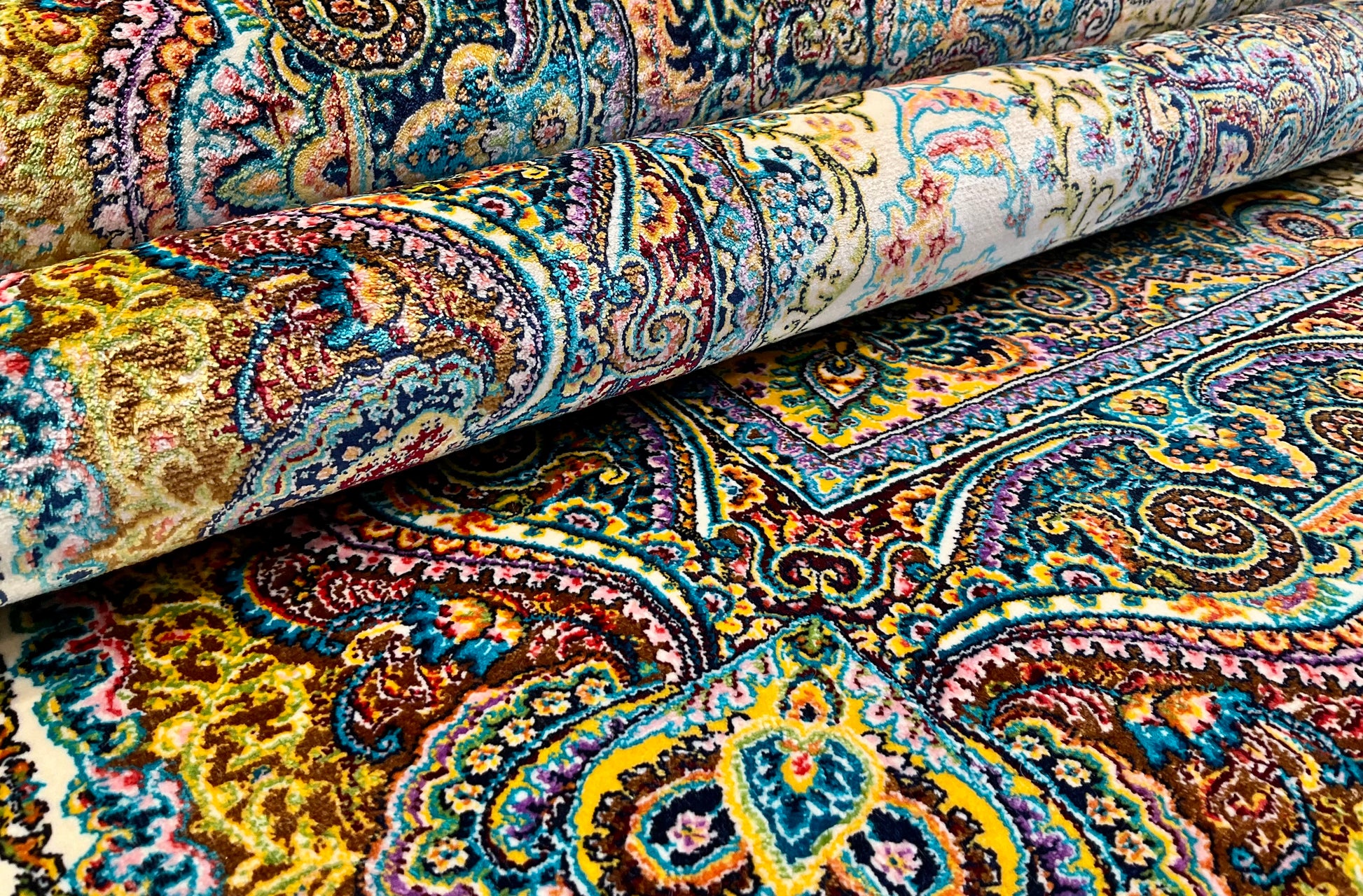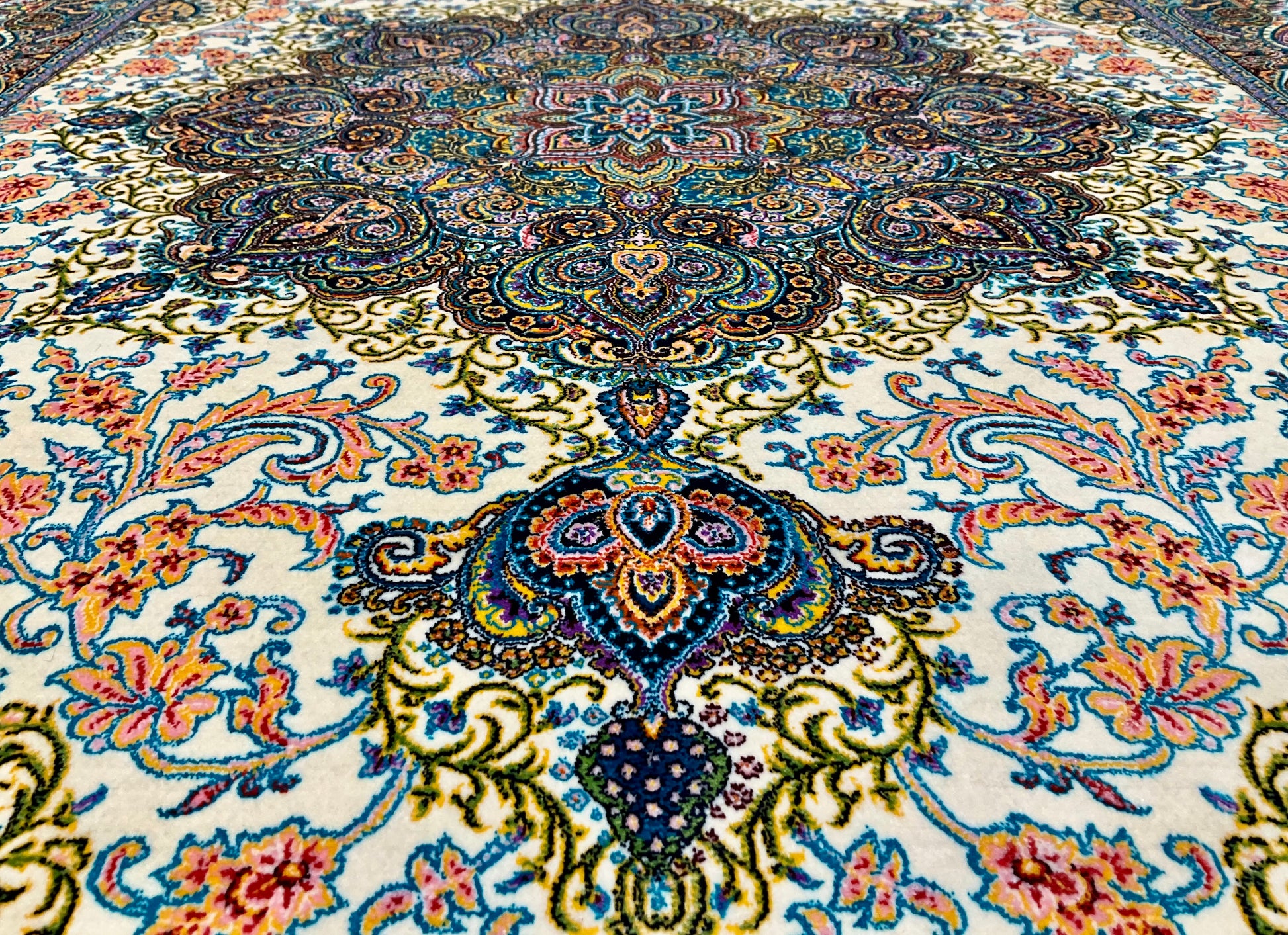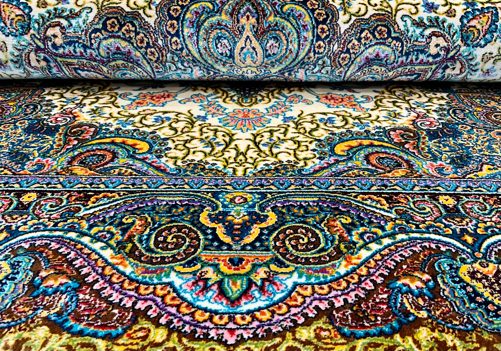 機械織り絨毯の特長として、サイズやノットが均一で精度が高く仕上がる点が挙げられます(フリンジ部分は手作業で仕上げられます)。また、ペルシャ絨毯ならではの美しいデザインや質感は、五大産地のひとつカシャーンで制作されているため、手織り絨毯に劣らない美しさを誇ります。