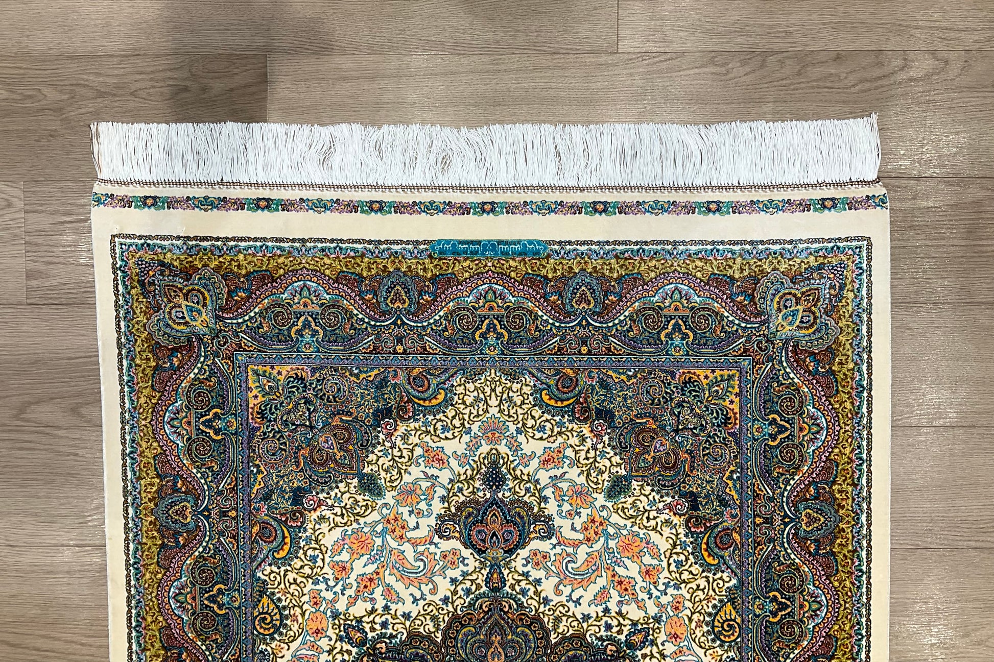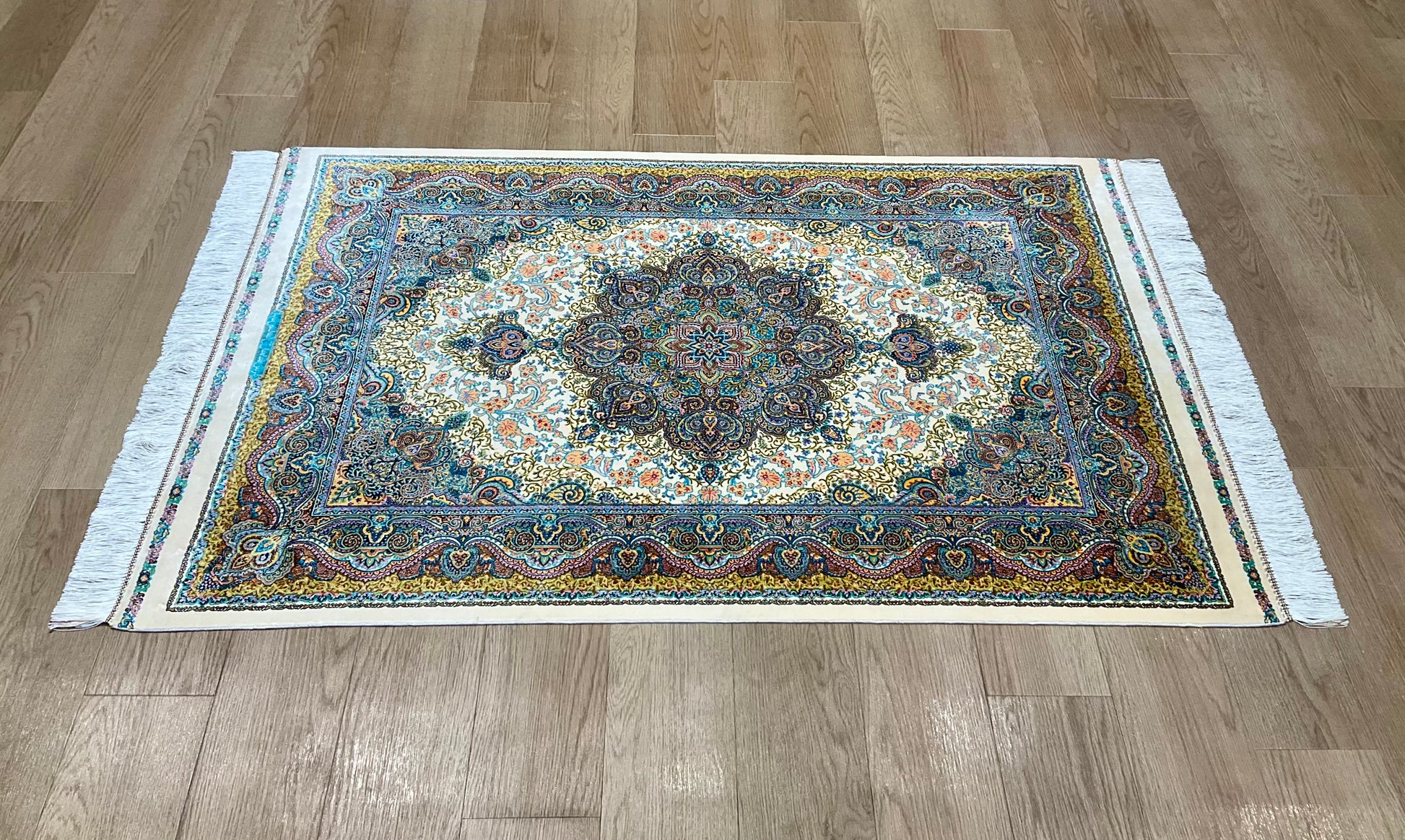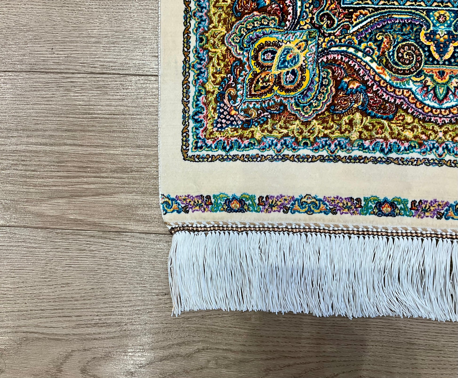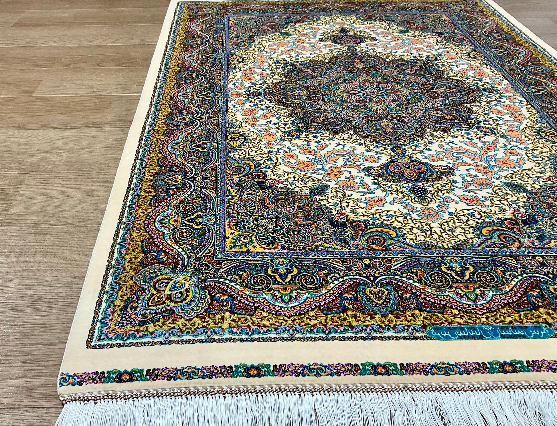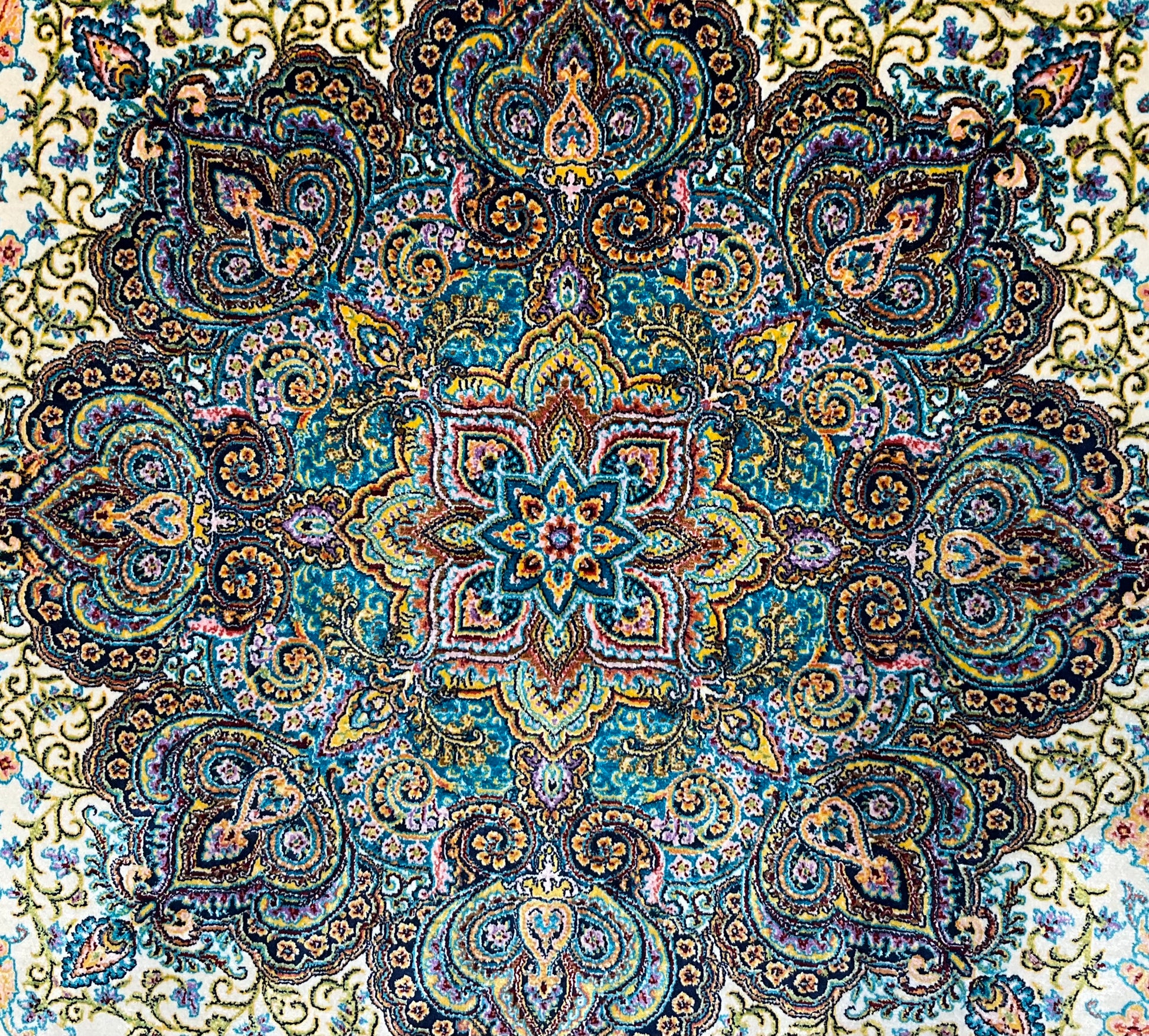 機械織り絨毯の特長として、サイズやノットが均一で精度が高く仕上がる点が挙げられます(フリンジ部分は手作業で仕上げられます)。また、ペルシャ絨毯ならではの美しいデザインや質感は、五大産地のひとつカシャーンで制作されているため、手織り絨毯に劣らない美しさを誇ります。