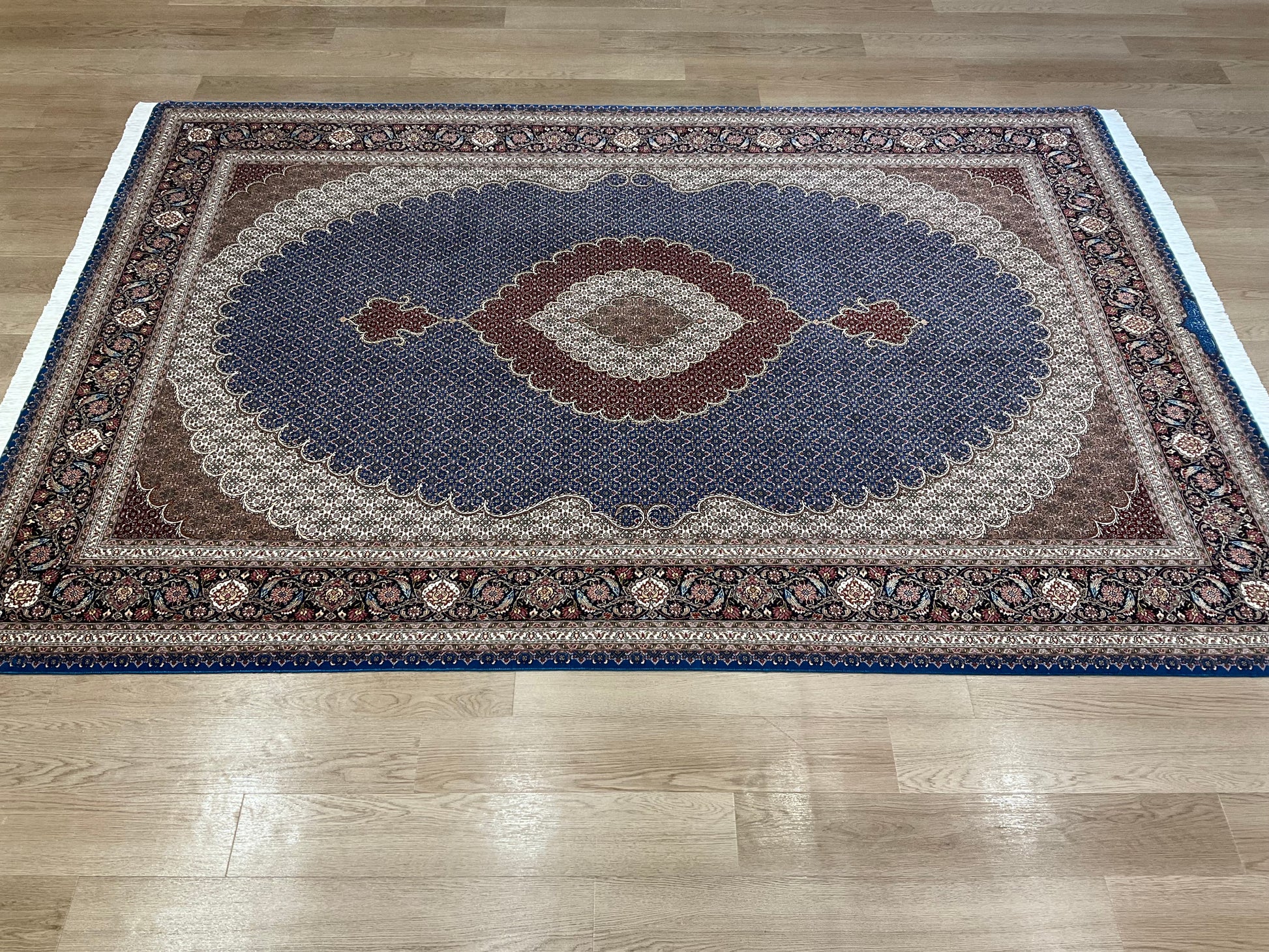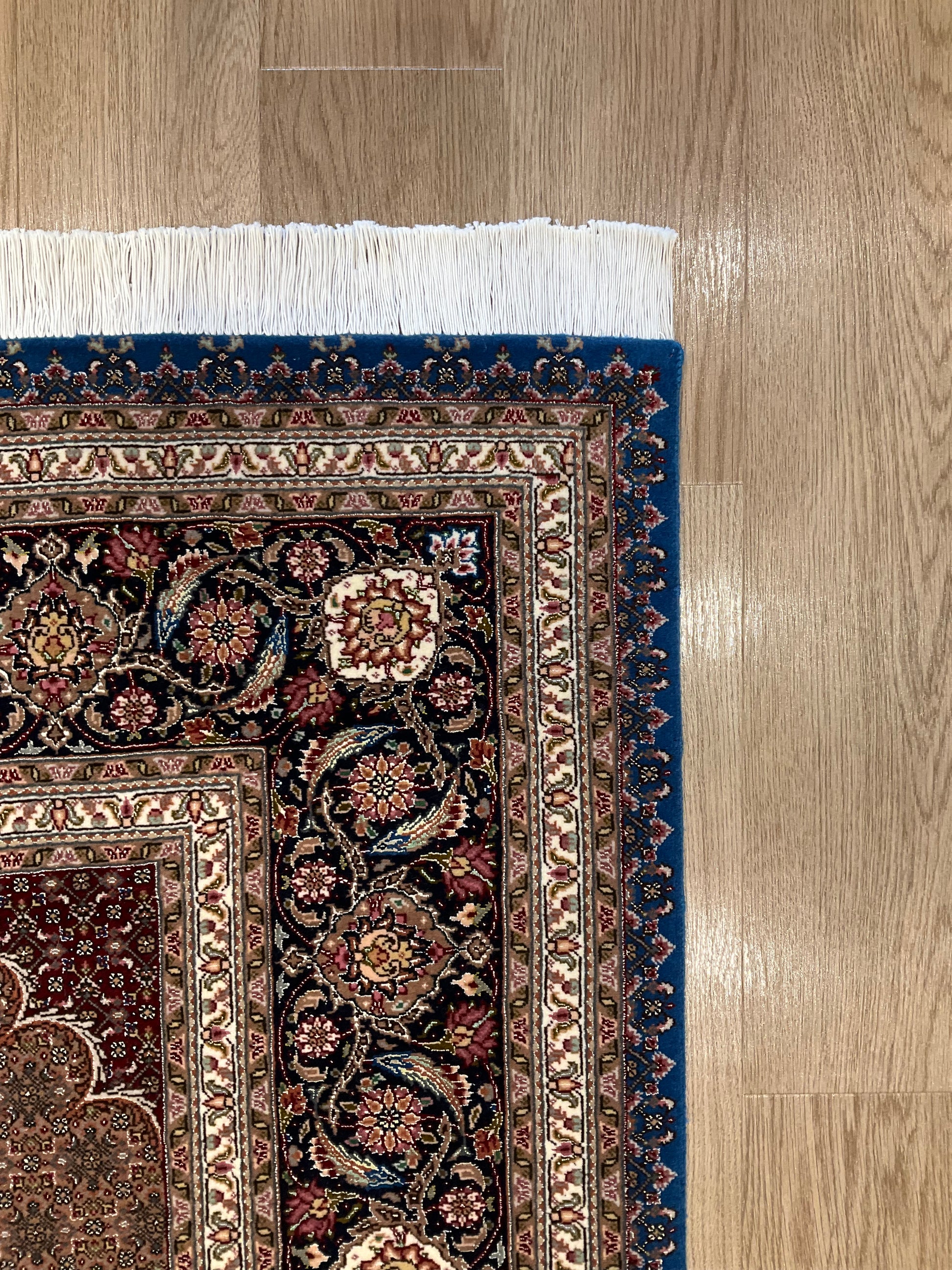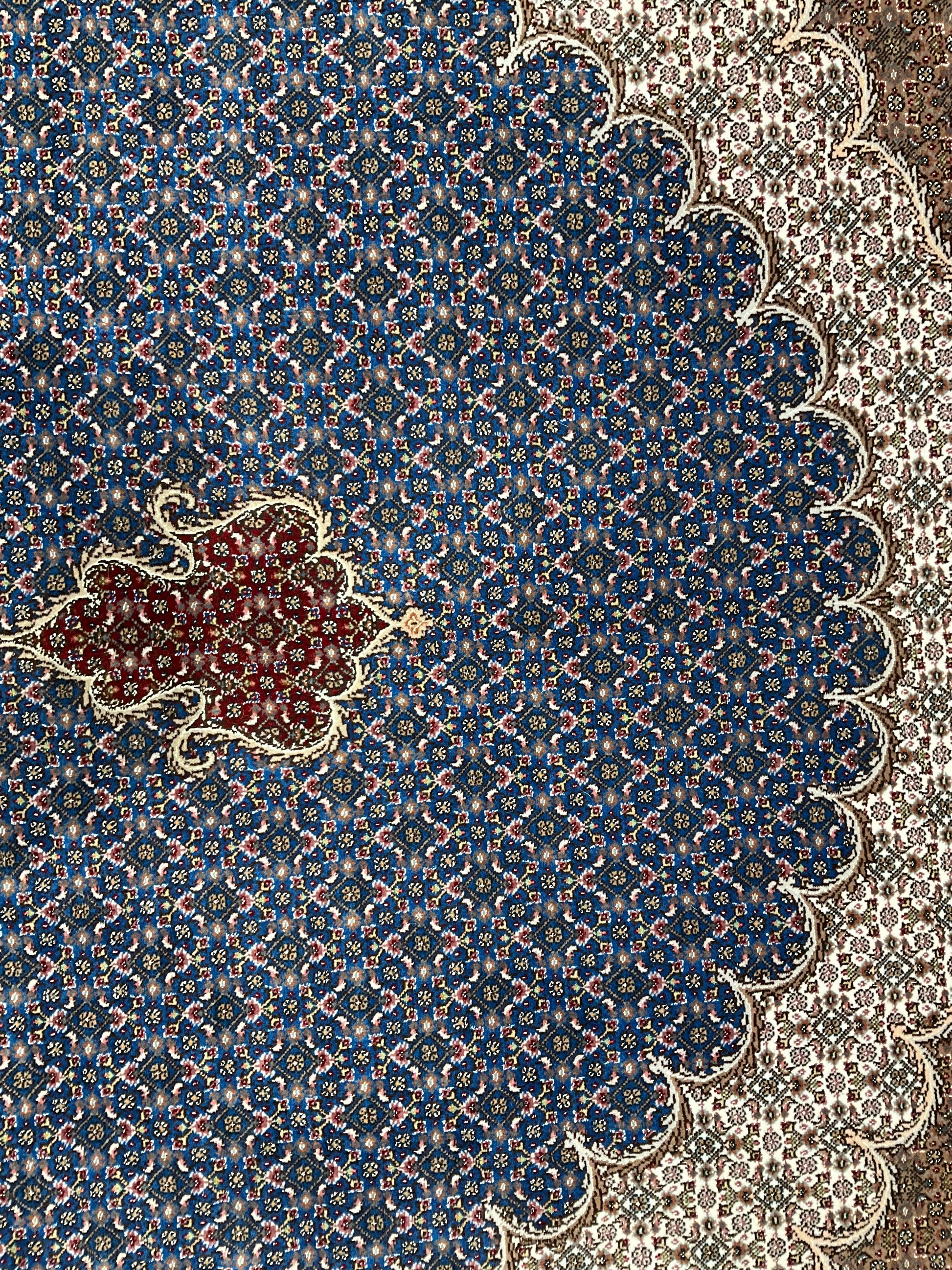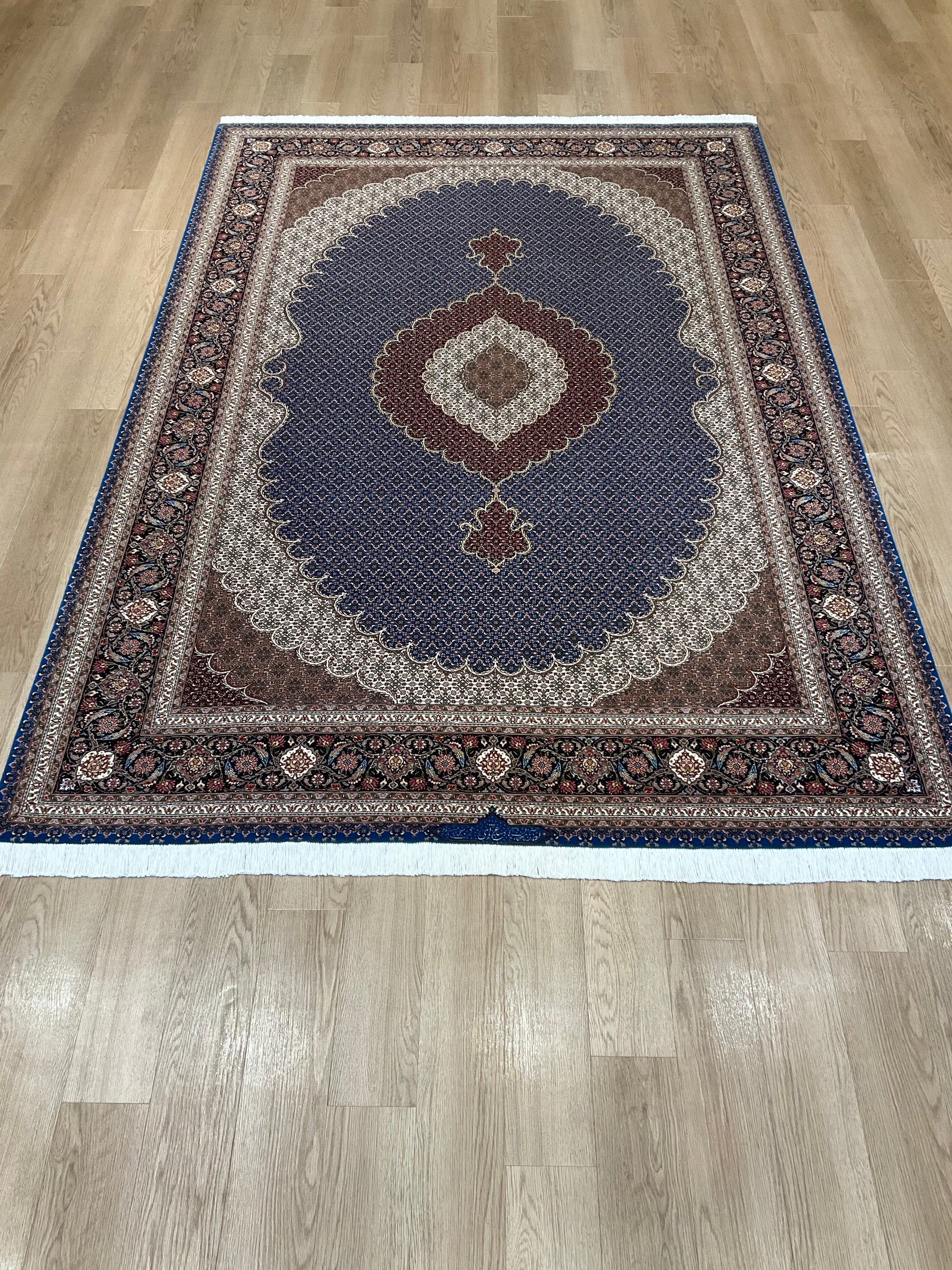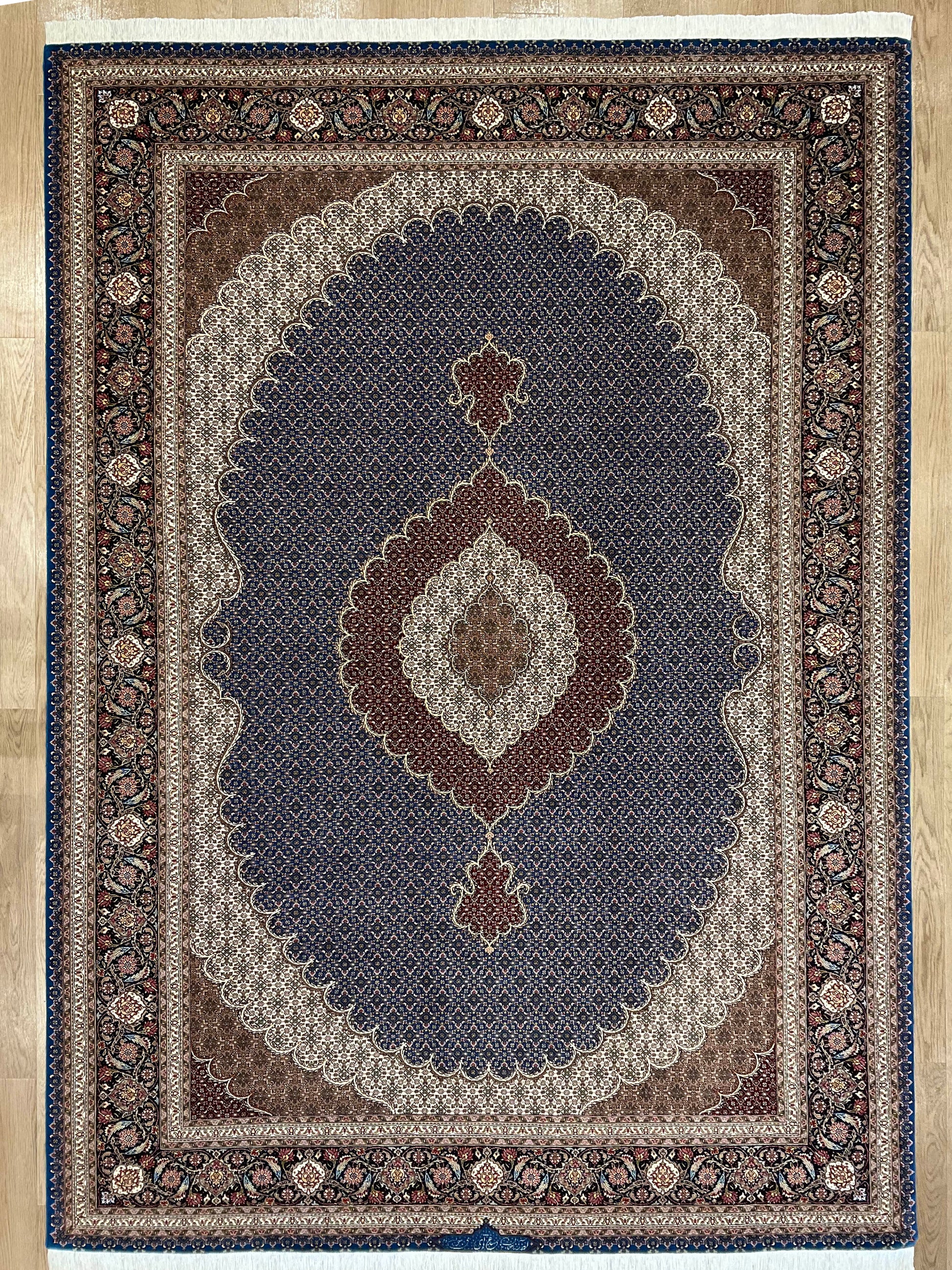 ペルシャ絨毯五大産地のひとつで、緻密な織り、荘厳なメダリオンデザイン、落ち着いた色合いが特徴の、格式高い伝統的なペルシャ絨毯です。タブリーズのデザインはベナム柄(王朝風)やマヒ柄(小魚文様)が代表的です。織密度が緻密で耐久性にとても優れています。