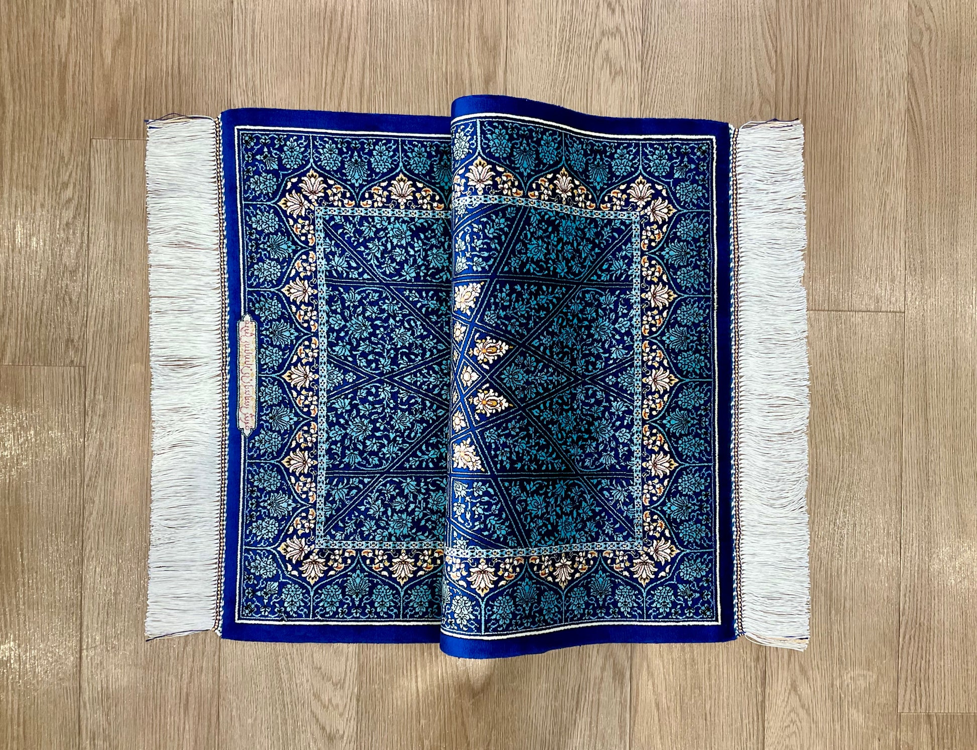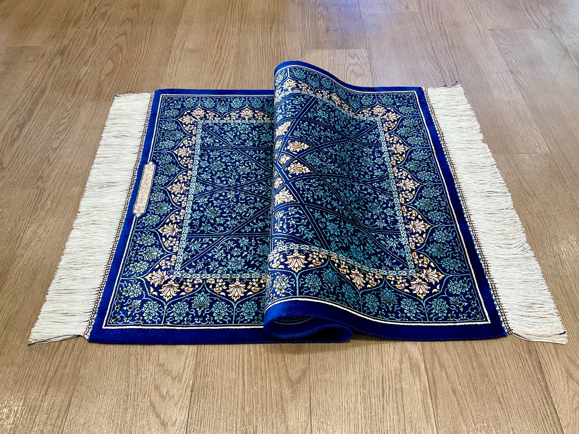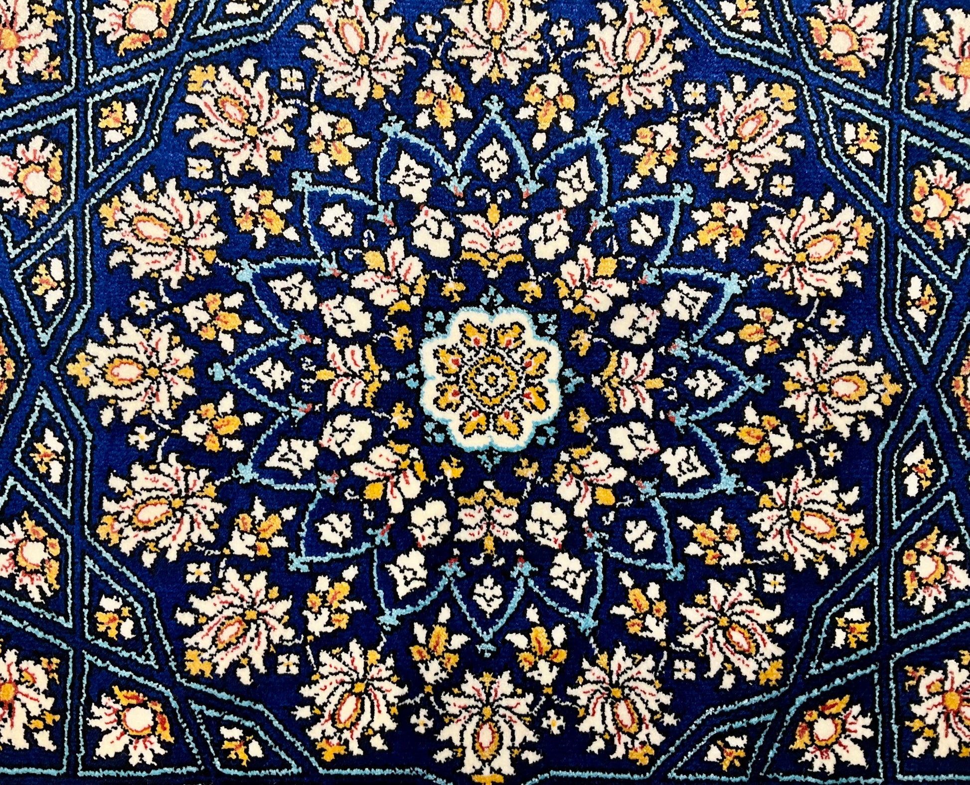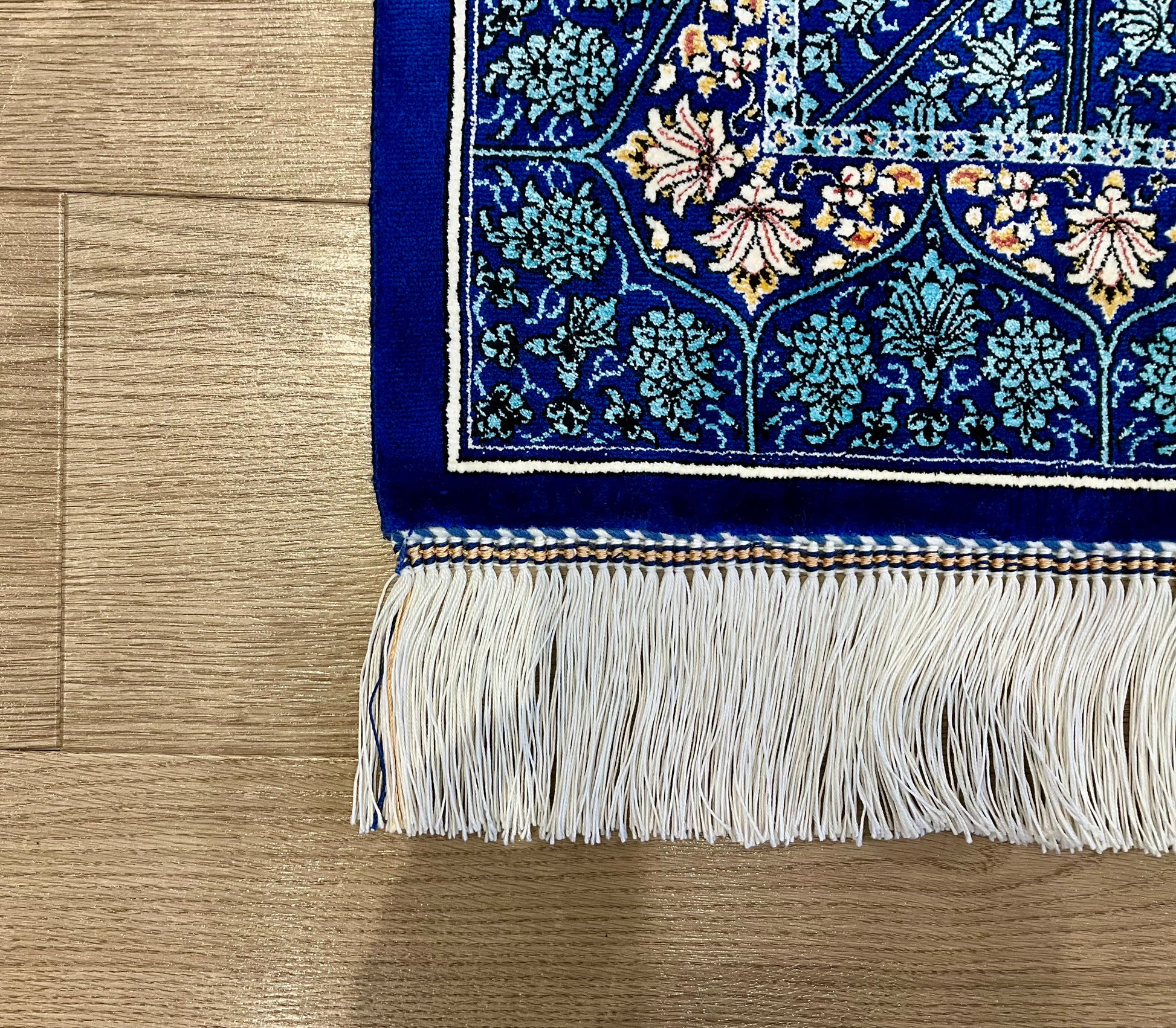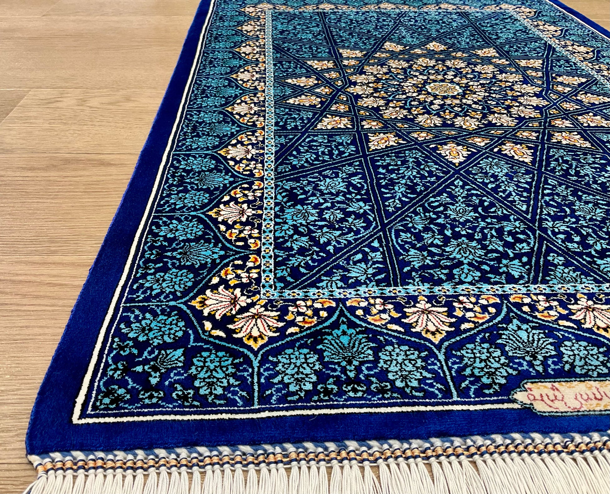 機械織り絨毯の特長として、サイズやノットが均一で精度が高く仕上がる点が挙げられます(フリンジ部分は手作業で仕上げられます)。また、ペルシャ絨毯ならではの美しいデザインや質感は、五大産地のひとつカシャーンで制作されているため、手織り絨毯に劣らない美しさを誇ります。